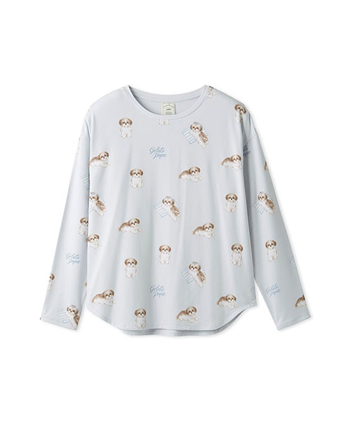 お気に入りの枕に寄り添う、リボンを付けたシーズー犬を描いたカットソーシリーズです。枕元でリラックスしたり、つぶらな瞳でこちらを見ていたり、色々な表情のシーズーを総柄プリントしたロングTシャツ。長めの丈感と、裾をラウンドさせたフェミニンなシルエットです。同シリーズのパンツや雑貨を合わせたり、シーズー好きの方へのギフトにもおすすめです。