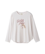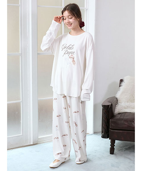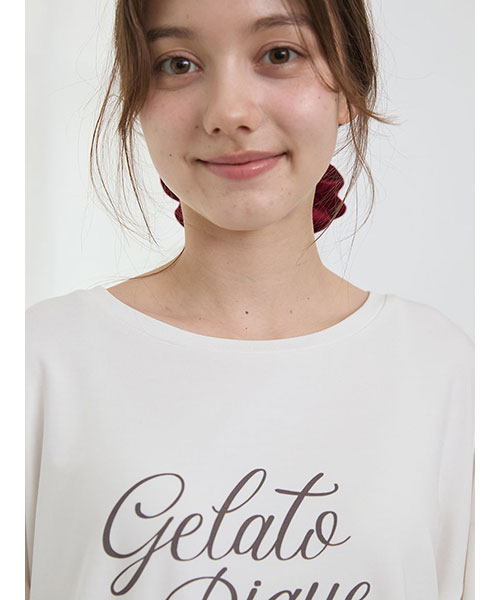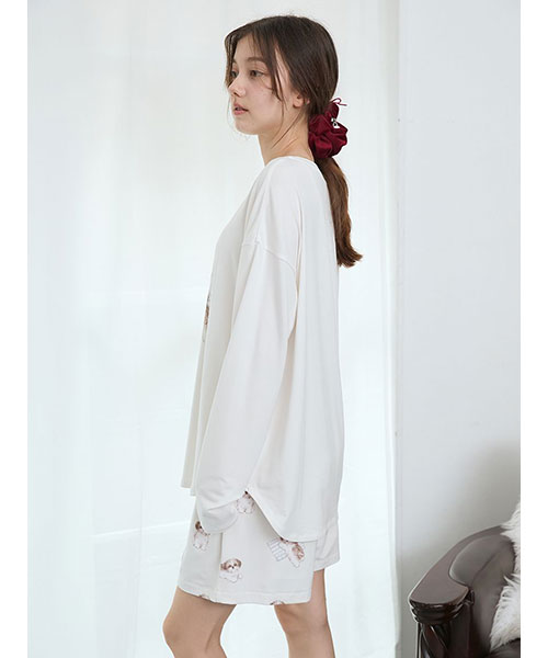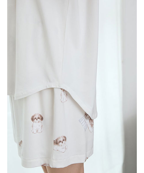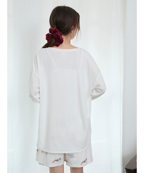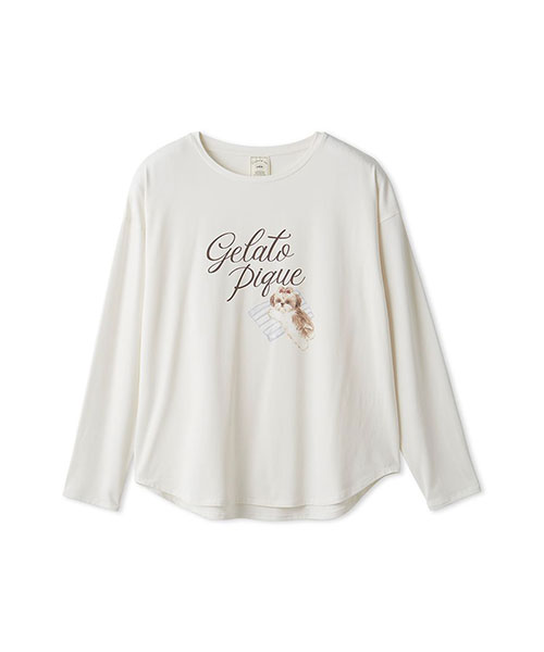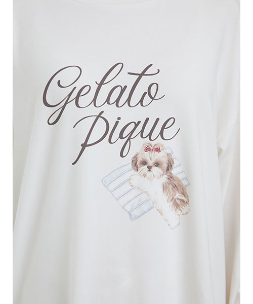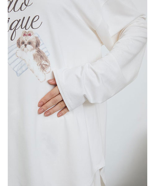 お気に入りの枕に寄り添う、リボンを付けたシーズー犬を描いたカットソーシリーズです。筆記体ロゴを大胆にデザインした、キャッチーなプリント入りのロングTシャツ。柔らかな素材感で、ゆったりとしたリラックス感のある着心地です。同シリーズのパンツや雑貨を合わせたり、シーズー好きの方へのギフトにもおすすめです。