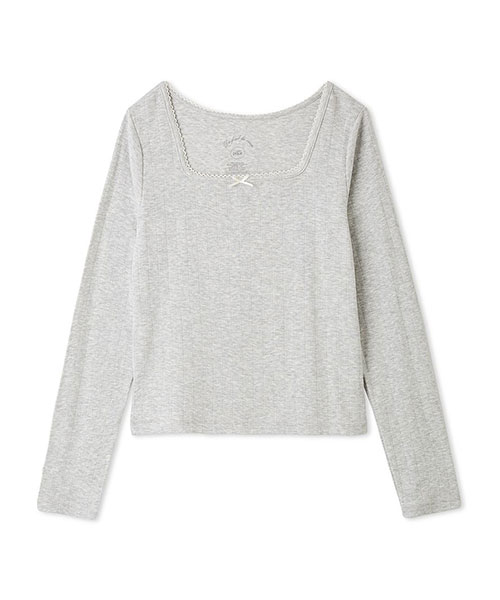 程良い厚みのある針抜きカットソーを使用したロングTシャツです。スクエア調のエレガントなネックラインがデコルテをきれいに見せるので、カーディガン等のインナーにも合わせやすい1枚。胸元にはピコレースと小さなリボンをあしらい、右袖口には手書き風のロゴもデザインしました。色はべーシックなオフホワイトとグレーの2色展開。同時期に展開するベビモコベアさがらカーディガンとコーディネートするのがおすすめです。