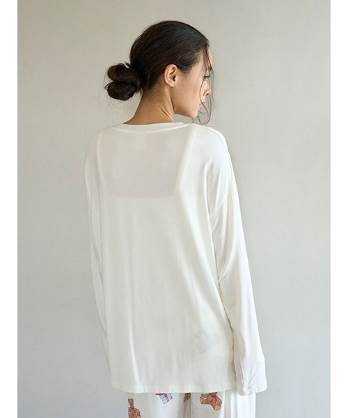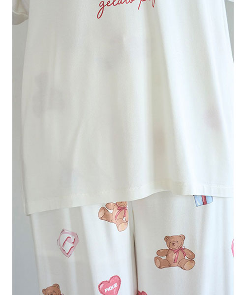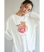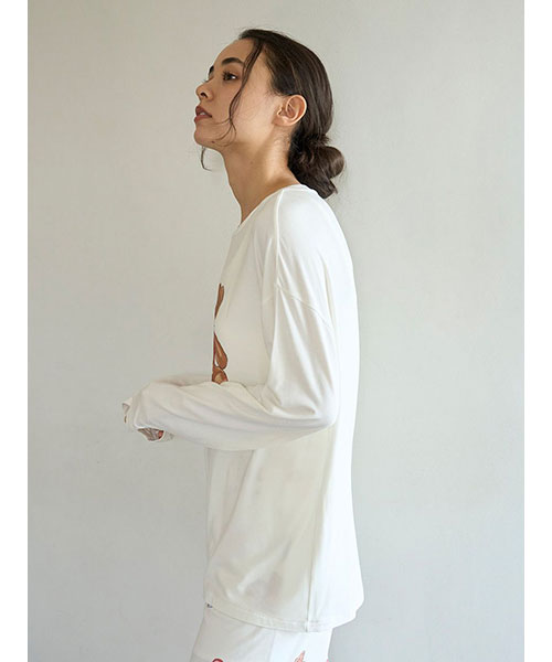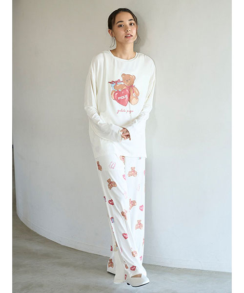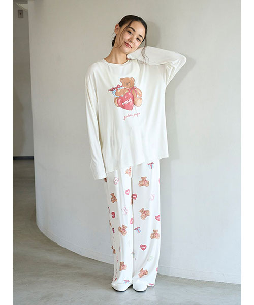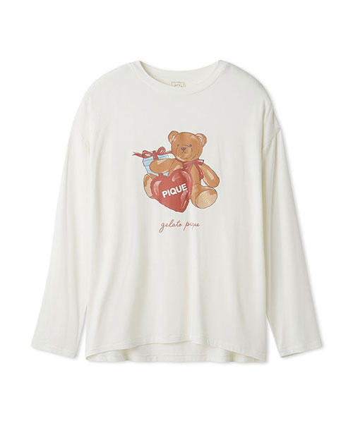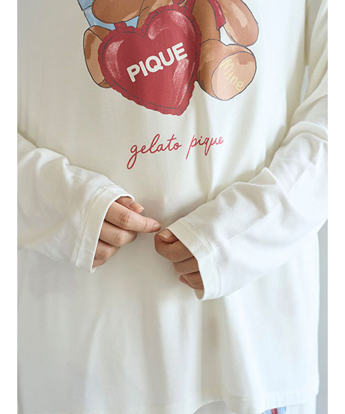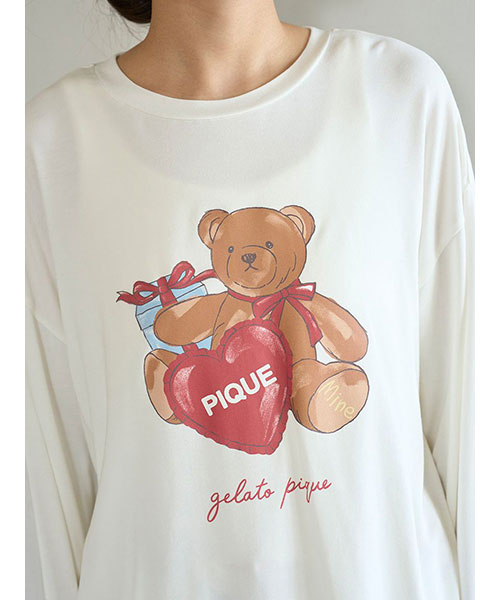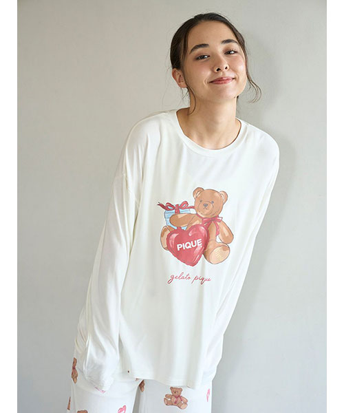 お気に入りのベアのぬいぐるみと暮らす、女の子のキュートなお部屋をイメージしたプリントカットソーのシリーズです。胸元にベアのぬいぐるみとギフトボックス、ハートのクッションを描いたワンポイントロングTシャツ。これからのホリデーシーズンにも似合うハートフルなデザインです。手書き風のロゴをさりげなく添え、ゆるっと可愛く着用いただけるシルエットに仕上げました。色は優しいオフホワイトとピンクの2色展開。同シリーズのロングパンツに合わせたり、お揃いの柄を使用したベビモコ素材のベアさがらシリーズと合わせるのもおすすめです。