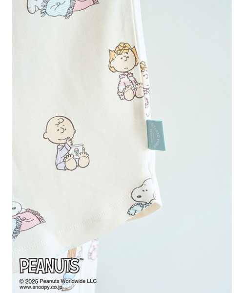 PEANUTSとgelato piqueのコラボレーションシリーズから、ファミリーでお楽しみいただける新作が登場。PEANUTSの仲間たちが、おやすみ前の幸せなひとときを過ごす様子をgelato piqueだけの特別なオリジナルアートに描き起こした、総柄プリントのヘンリーネックのプルオーバーです。枕で気持ちよさそうにしているスヌーピーや、アイスを食べているチャーリー・ブラウン、枕投げしているペパーミント パティなどの絵柄を散りばめました。色は優しい雰囲気のアイボリーと、杢グレーの2色をご用意。同シリーズの総柄ロングパンツと合わせたり、メンズサイズとのペアコーディネートもおすすめです。
