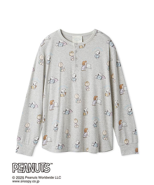PEANUTSとgelato piqueのコラボレーションシリーズから、ファミリーでお楽しみいただける新作が登場。PEANUTSの仲間たちが、おやすみ前の幸せなひとときを過ごす様子をgelato piqueだけの特別なオリジナルアートに描き起こした、総柄プリントのヘンリーネックのプルオーバーです。枕で気持ちよさそうにしているスヌーピーや、アイスを食べているチャーリー・ブラウン、枕投げしているペパーミント パティなどの絵柄を散りばめました。色は優しい雰囲気のアイボリーと、杢グレーの2色をご用意。同シリーズの総柄ロングパンツと合わせたり、メンズサイズとのペアコーディネートもおすすめです。