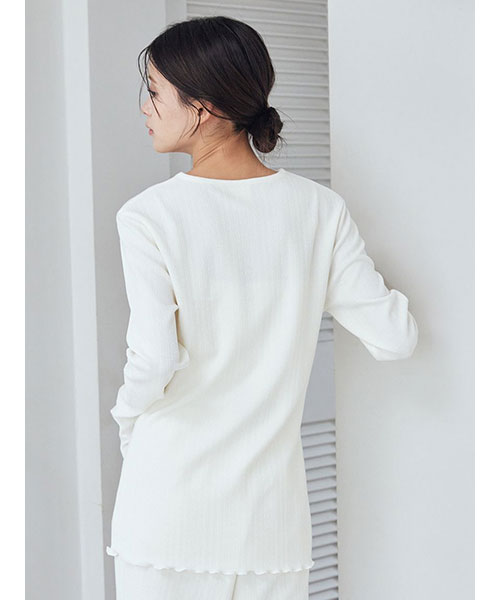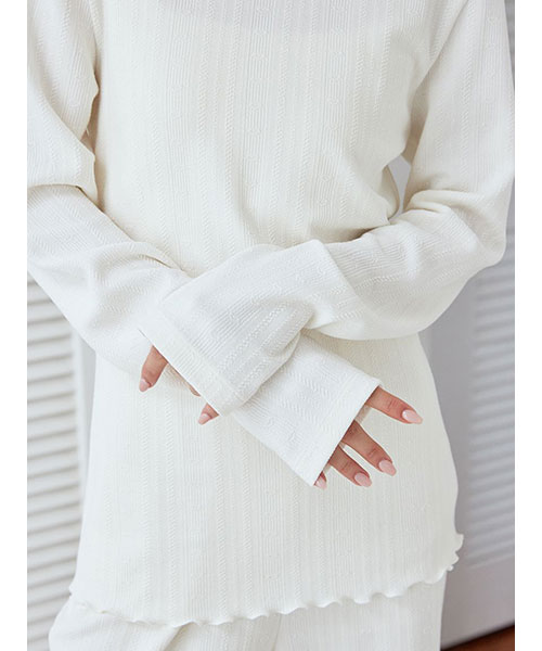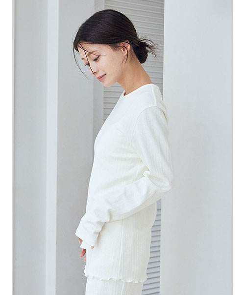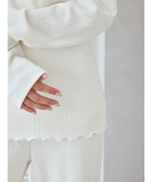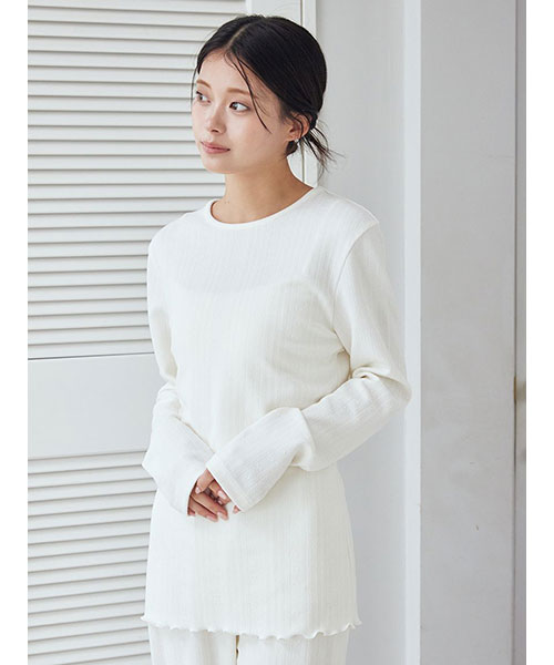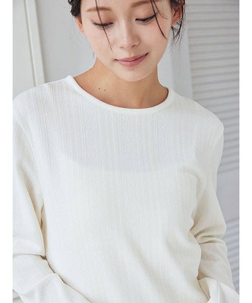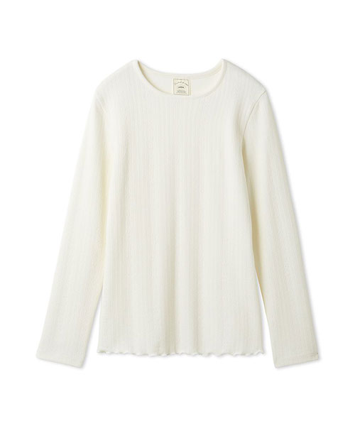 小さなハート柄のアラン模様を、ふくれジャガードで表現したカットソーシリーズ。肌寒い時期のインナーに重宝する、シンプルでストレッチ性に富むプルオーバーです。シルエットはすっきりとしていますが、袖丈や着丈が長めで上半身をしっかりとカバーするので、安心感のある着心地。パーカやカーディガンを羽織って幅広く着回し可能です。シリーズ共通であしらったゴールドのプレートがさりげないアクセント。色はクリームとブラウンの2色をご用意しました。同シリーズのボトムに合わせたり、同時期に展開するハート柄ニットシリーズとのコーディネートもおすすめです。