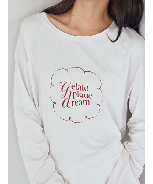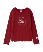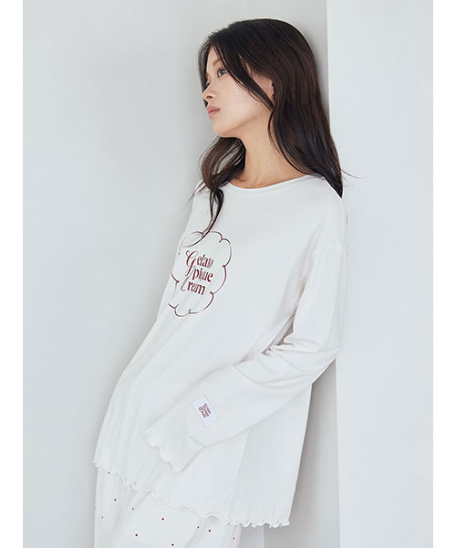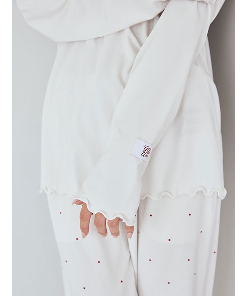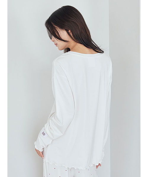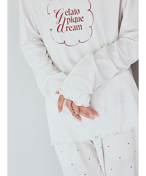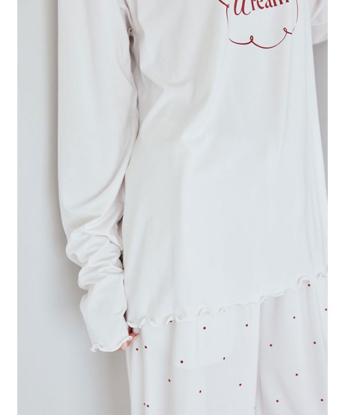 HOLIDAYシーズンの幸せな気分を表現した、季節感のあるカットソーシリーズです。袖口や裾にメローステッチを入れたロングTシャツは、カジュアルに寄りすぎないフェミニンなシルエットがポイント。柔らかな肌触りのカットソーは裏側が微起毛になっているので、寒い季節にも温かく着用いただけます。フロントにワンポイントでプリントを入れました。色はオフホワイトとレッドの2色展開。同シリーズのドット柄パンツとセットアップで着用いただけます。