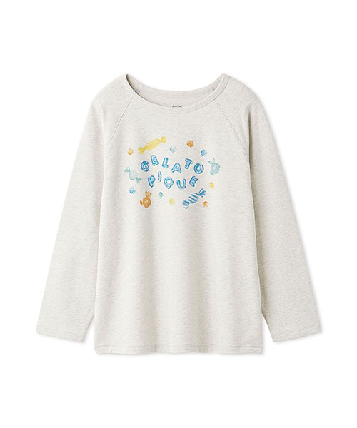 gelato piqueらしいベアやロゴモチーフのカラフルなキャンディを散りばめた、HAPPYな雰囲気のワンポイントロングTシャツです。季節の変わり目に1枚でも着用いただける、程良くふっくらとしたコットン混のインレイ素材を使用。腕周りにストレスがないラグランスリーブでお作りしました。色はピンクと杢グレーの2色展開。同シリーズのロングパンツや、同時期に展開するベビモコカラフルボーダーシリーズと合わせるのがおすすめ。KIDS、BABYとのリンク・コーディネートもお楽しみいただけます。