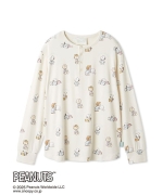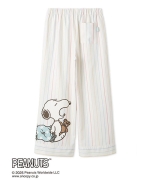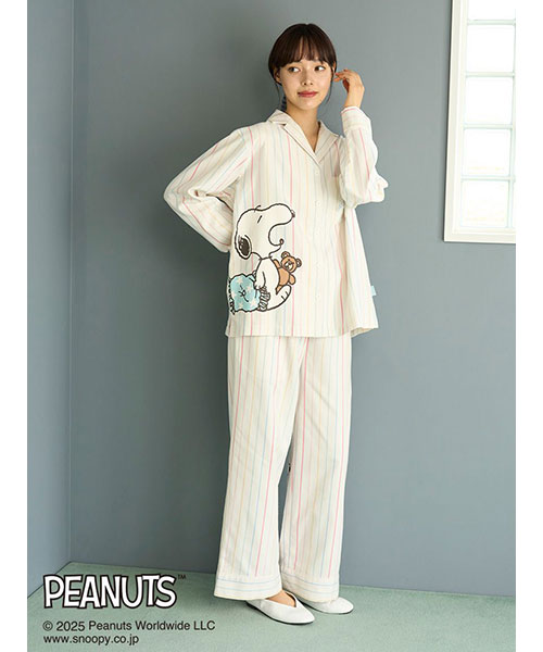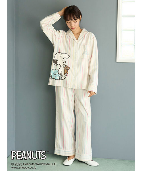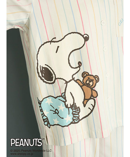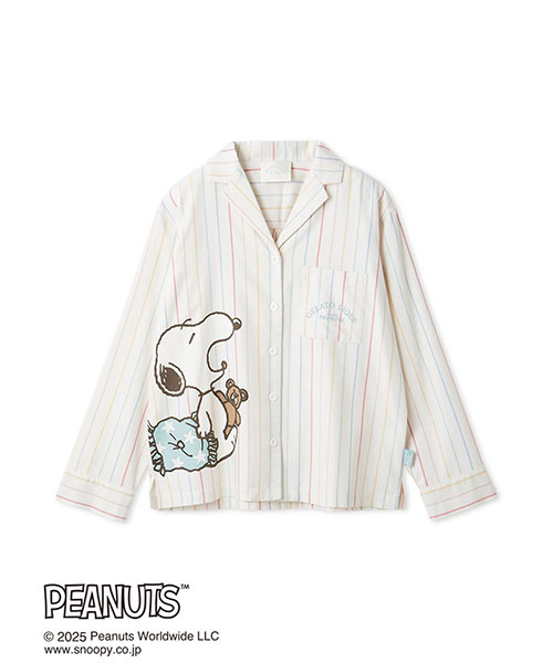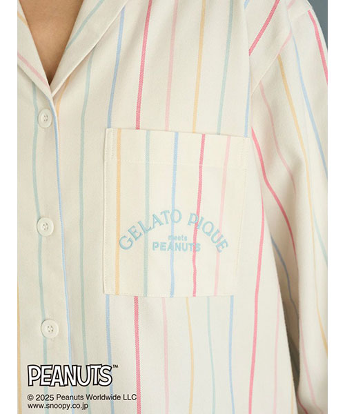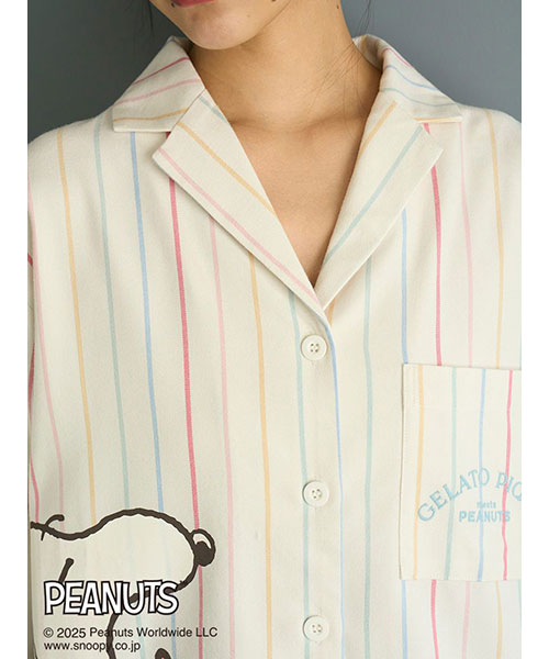 PEANUTSとgelato piqueのコラボレーションシリーズから、ファミリーでお楽しみいただける新作が登場。PEANUTSの仲間たちが、おやすみ前の幸せなひとときを過ごす様子をgelato piqueだけの特別なオリジナルアートで表現しました。柔らかい肌触りに癒される、5色ストライプ柄のネル生地を使用した開襟シャツ。ふかふかの枕を持って、あくびをしながらベッドへ向かうスヌーピーを、前見頃の右脇に大きくプリントしました。胸ポケットには、gelato piqueならではのミントカラーのアーチロゴを刺繍。ゆったりとしたサイズ感も可愛い1枚です。同シリーズのロングパンツや小物と組み合わせてお楽しみください。