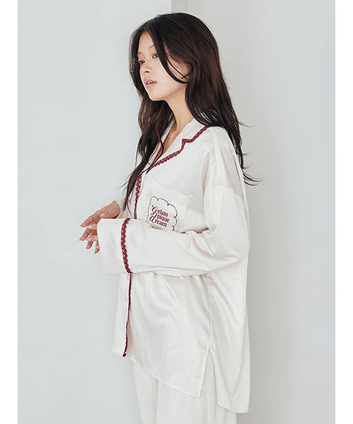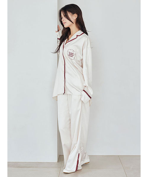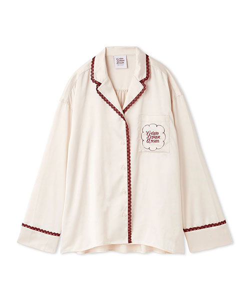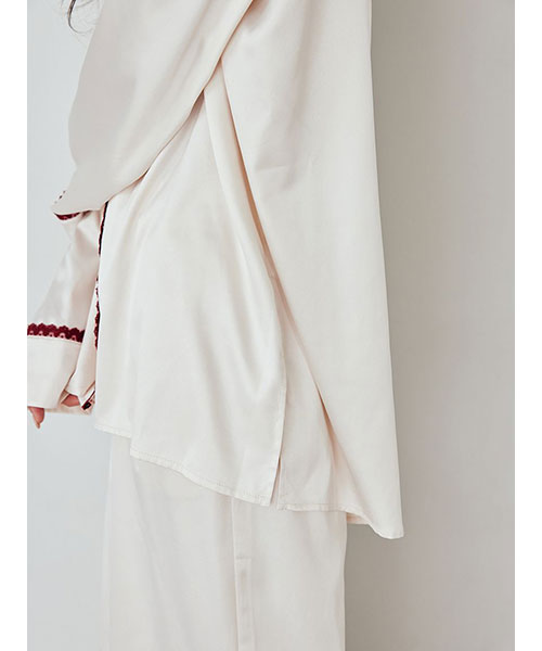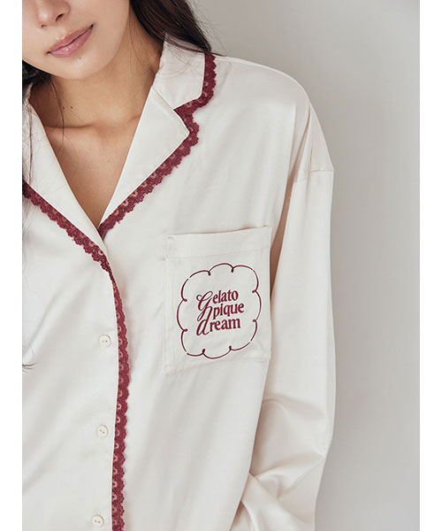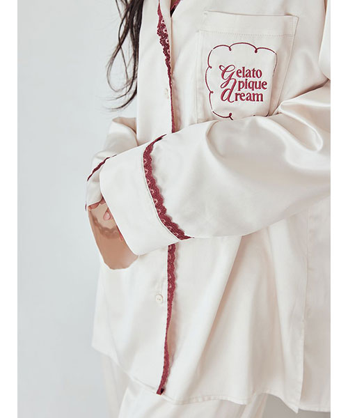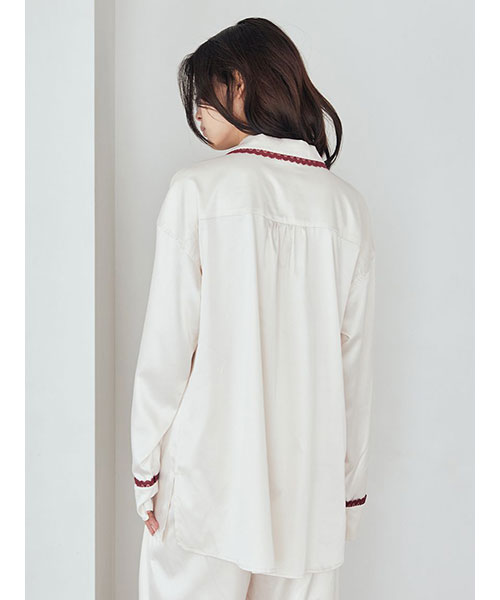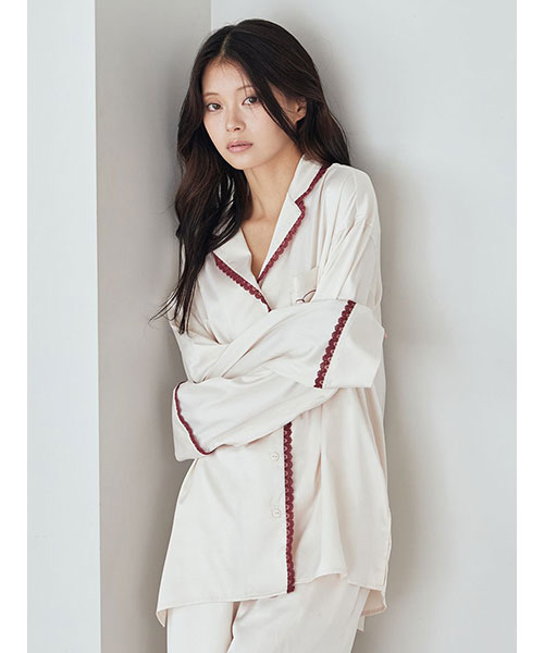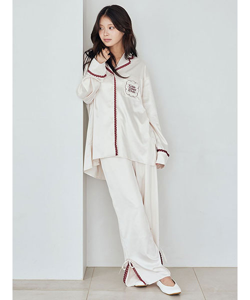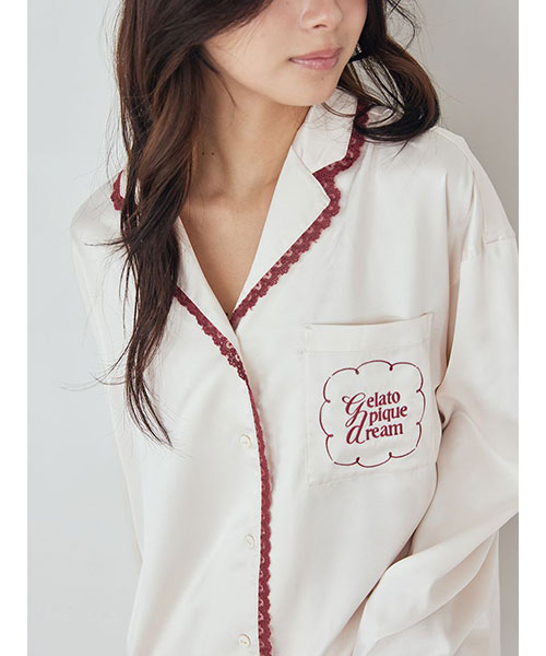 艶やかな光沢感がHOLIDAYの幸せな気分を盛り上げる、配色レース付きのサテンシリーズです。胸ポケットの赤いロゴ刺繍がキャッチーな開襟シャツは、襟や袖などにあしらったレースがポイント。後ろ裾がやや長いシルエットで、程良い抜け感を演出します。色は品の良いオフホワイトと柔らかなピンクの2色展開。同シリーズのロングパンツを合わせたり、同時期に展開するラメフェザーニットシリーズとの組み合わせもおすすめです。