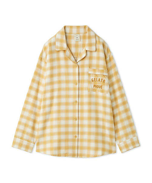 明るいチェック柄でトレンドのプレッピースタイルを意識した、カジュアルなネル素材のルームウェアシリーズです。ゆったりとしたシルエットがリラックス感を誘う開襟シャツは、パイピング入りで品の良さも漂わせるアイテム。胸ポケットにはサガラ刺繍を入れ、カフスにもボタンを付けてプレッピー感を演出しました。色は柔らかいイエローと、爽やかなブルーの2色展開。同シリーズのパンツと合わせたり、同時期に展開するプレッピーニットシリーズとのコーディネートもおすすめです。