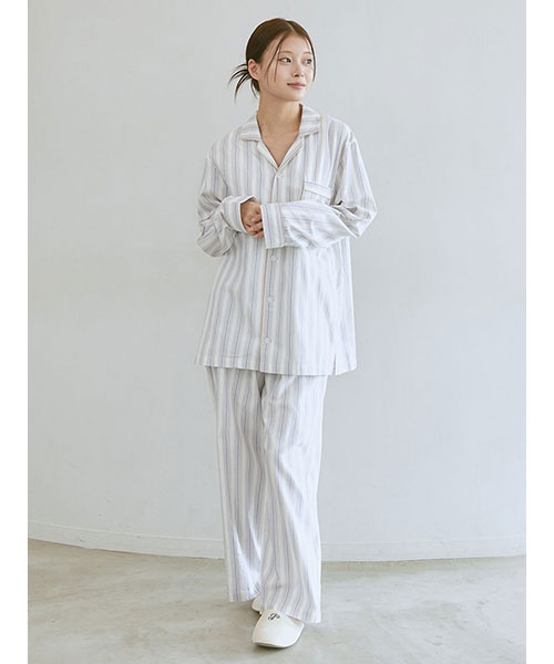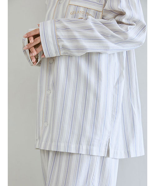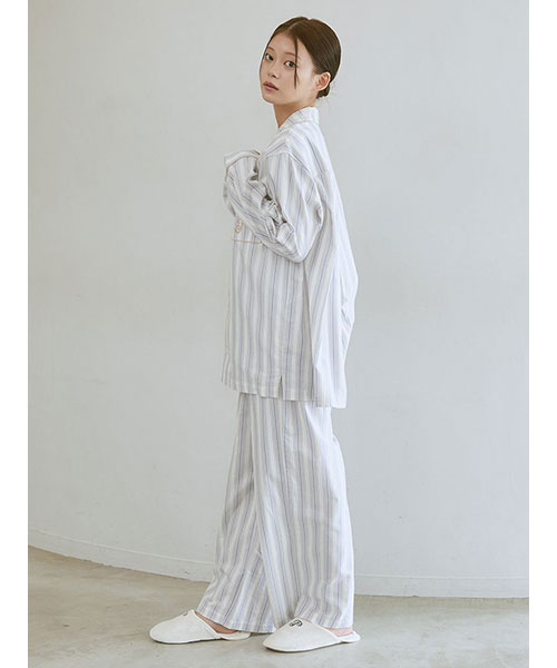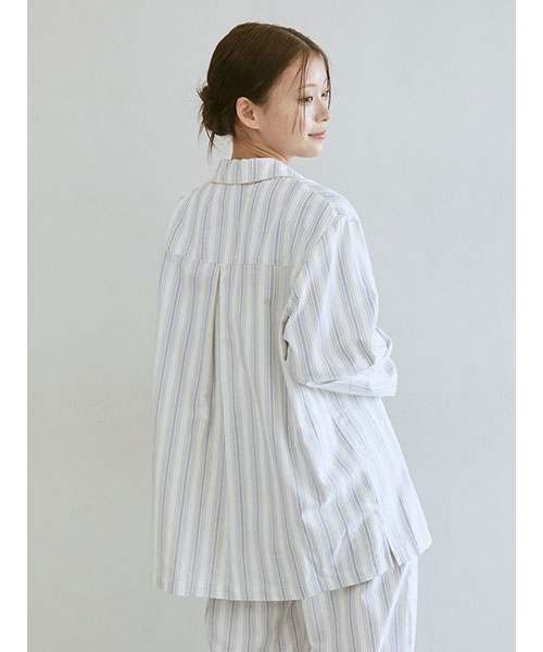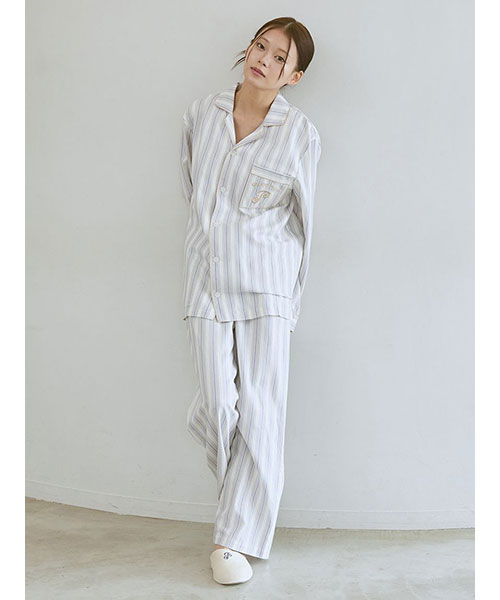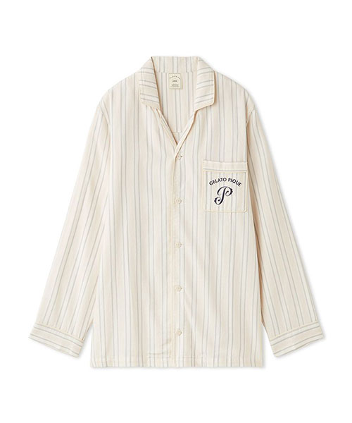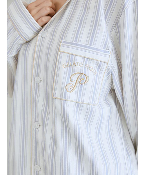 『P』をモチーフにした上品なオリジナルエンブレムが目を引く、ホテルライクな大人のルームウェアシリーズです。柔らかな配色の先染めストライプ生地を使用した開襟シャツ。先染め糸ならではの風合いの良さとソフトな肌当たりで、1日の終わりにホッとさせてくれる1枚です。胸ポケットにエンブレムとロゴの刺繍を入れ、配色パイピングで丁寧に仕上げました。ゆったりとしたシルエットと、つかみやすい大きめのボタンがポイントです。色は飽きのこないベージュとブルーの2色展開。同シリーズのストライプパンツと合わせたり、お揃いの柄の小物とコーディネートしてお楽しみいただけます。