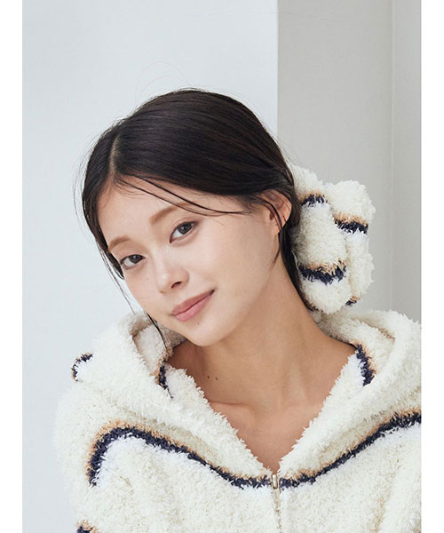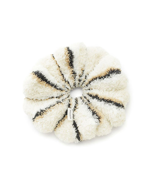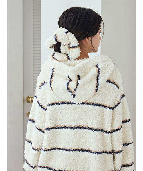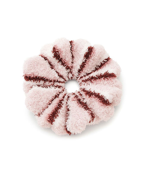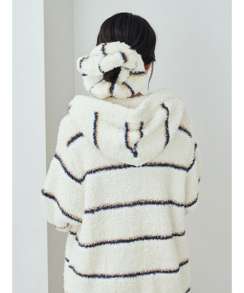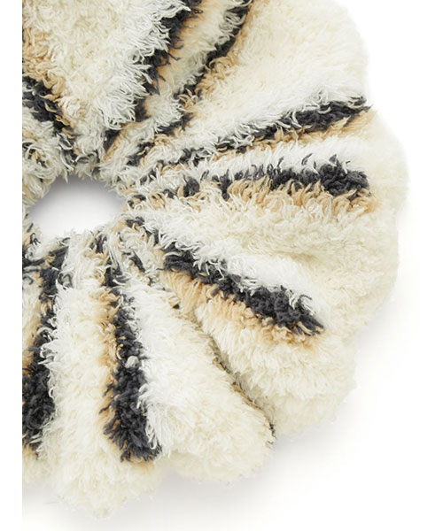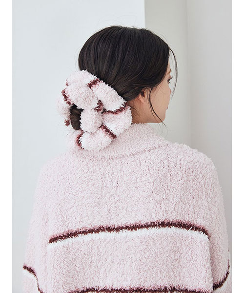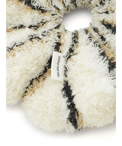 トレンドの細いピッチのボーダー柄を、毛足の長いもこもこ素材’ジェラート’に落とし込んだシリーズです。‘ジェラート’素材ならではのふわふわなボリューム感がキュートなシュシュは、秋冬コーディネートのアクセントに最適。細いピッチの中にもしっかり配色を効かせて、今っぽいスクールテイストに仕上げました。色は甘いジェラートのようなアイボリーとピンク、ブルーの3色展開。同シリーズのルームウェアと合わせたり、ギフトにもおすすめのアイテムです。