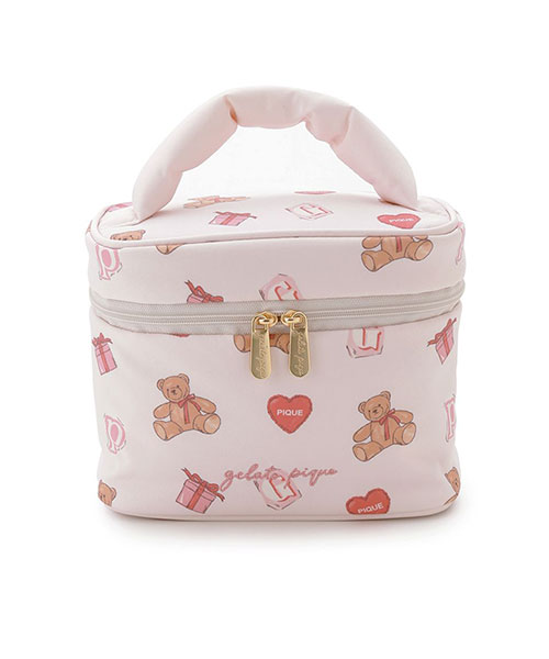 お気に入りのベアのぬいぐるみと暮らす、女の子のキュートなお部屋をイメージしたフェイバリット柄の小物シリーズです。ベアのぬいぐるみとギフトボックス、ハートのクッション、雑誌から切り抜いた『P』と『G』を総柄プリントした、さらっとしたポリエステル素材のバニティポーチ。ハンドルや本体に少量の中綿を入れ、ふんわりとした手触りに仕上げています。スキンケアやメイクアイテムがしっかり収納でき、内ポケットも充実しているので、お部屋での普段使いから旅行まで様々なシーンで大活躍。フロントにはロゴ刺繍も入れました。色は優しいオフホワイトとピンクの2色展開。同シリーズのウェアやポーチと組み合わせたり、ギフトにもおすすめです。
