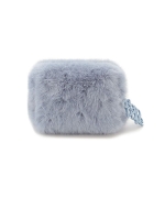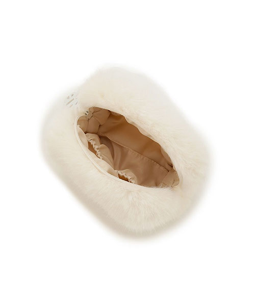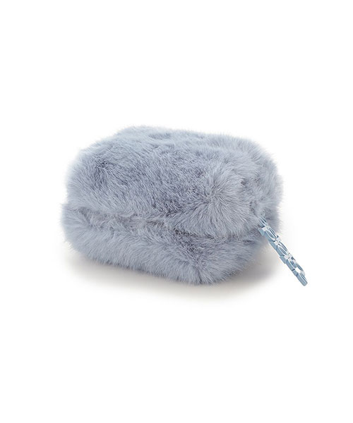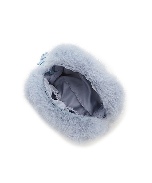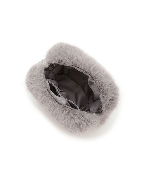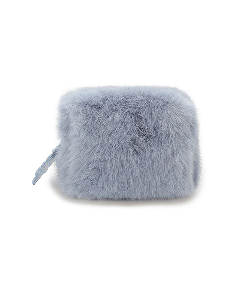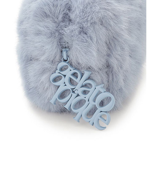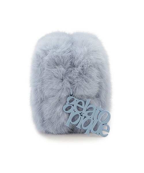 毛足が長めのリッチなファー素材に、大きめのロゴデザインをあしらったスタイリッシュなミニポーチです。シンプルなスクエア型で、ファスナーの引き手に存在感のあるロゴチャームを付けました。片手で持てる小さなサイズ感ですが、マチ幅があるのでお化粧直しのコスメ等がしっかり入ります。色はアイボリーとブルー、グレーの3色展開。同シリーズの小物を組み合わせてギフトにもおすすめです。