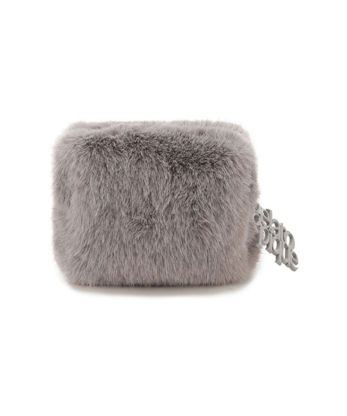 毛足が長めのリッチなファー素材に、大きめのロゴデザインをあしらったスタイリッシュなミニポーチです。シンプルなスクエア型で、ファスナーの引き手に存在感のあるロゴチャームを付けました。片手で持てる小さなサイズ感ですが、マチ幅があるのでお化粧直しのコスメ等がしっかり入ります。色はアイボリーとブルー、グレーの3色展開。同シリーズの小物を組み合わせてギフトにもおすすめです。