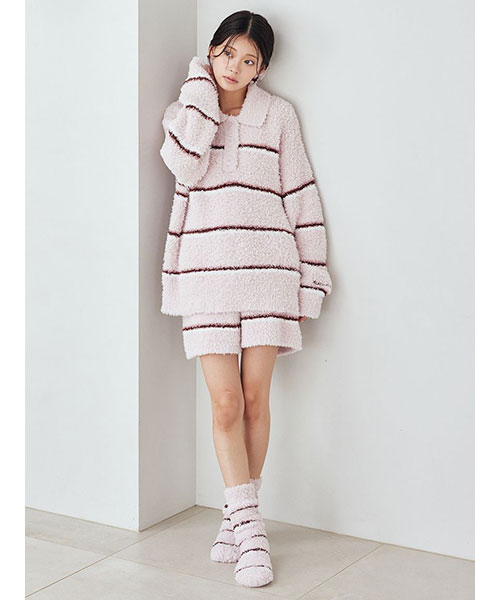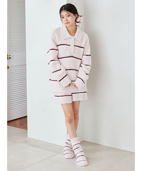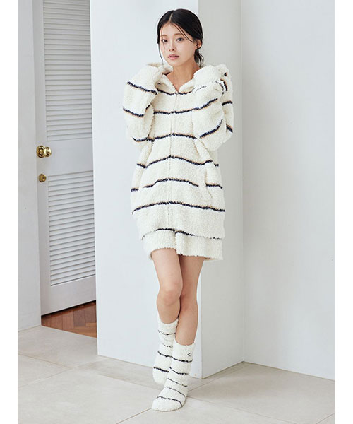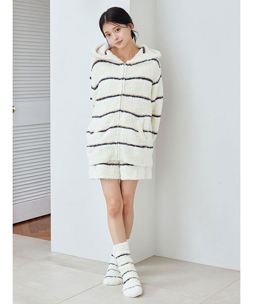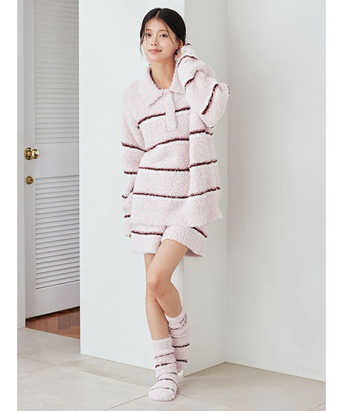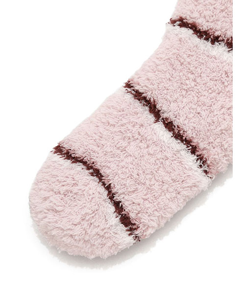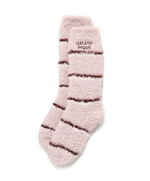 トレンドの細いピッチのボーダー柄を、毛足の長いもこもこ素材’ジェラート’に落とし込んだシリーズです。‘ジェラート’素材ならではのふわふわなはき心地をお楽しみいただける、定番のルームソックスです。ワンポイントでブランドのロゴ刺繍入り。細いピッチの中にもしっかり配色を効かせて、今っぽいスクールテイストに仕上げました。色は甘いジェラートのようなアイボリーとピンク、ブルーの3色展開。同シリーズのルームウェアと合わせたり、ギフトにもおすすめのアイテムです。