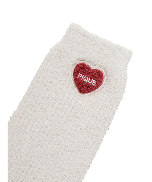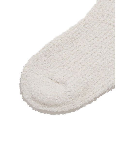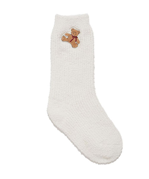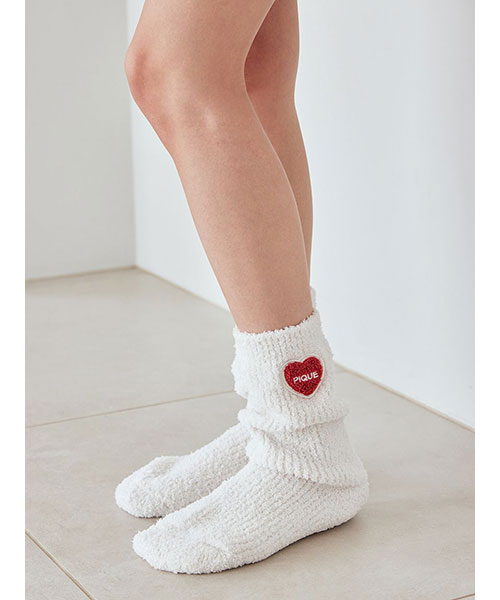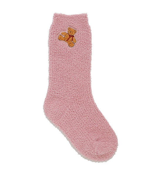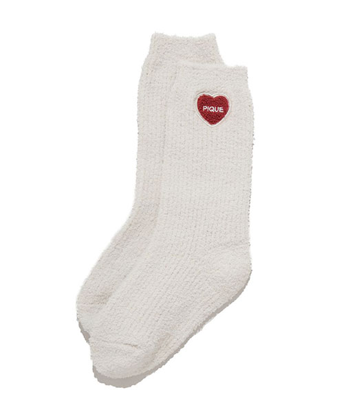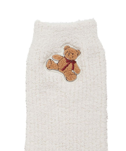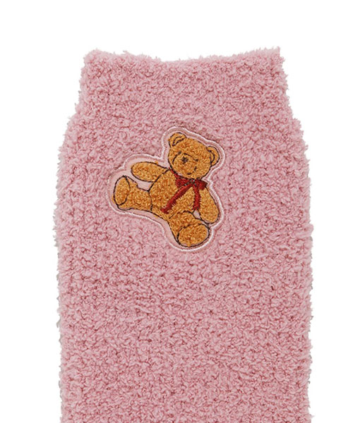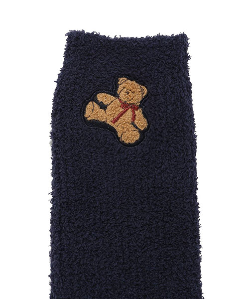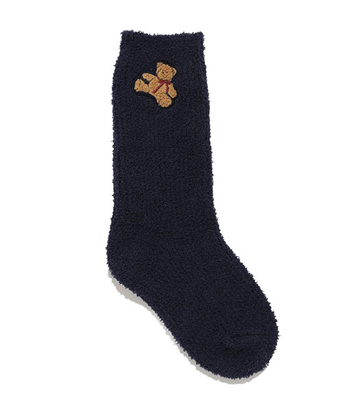 お気に入りのベアのぬいぐるみと暮らす、女の子のキュートなお部屋をイメージしたシリーズです。もっちり柔らかい‘ベビモコ’を畦編みにして使用したルームソックス。左右に違うモチーフをデザインしており、ベアのぬいぐるみと、ハートのクッションをふわふわのサガラ刺繍で表現しています。色はアイボリー、ピンク、ネイビーの3色展開。同シリーズのルームウェアに合わせたり、お揃いの柄を使用したフェイバリット柄シリーズと組み合わせてお楽しみください。
