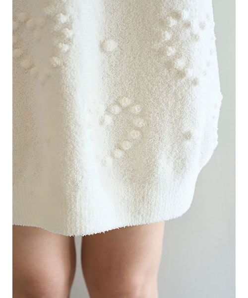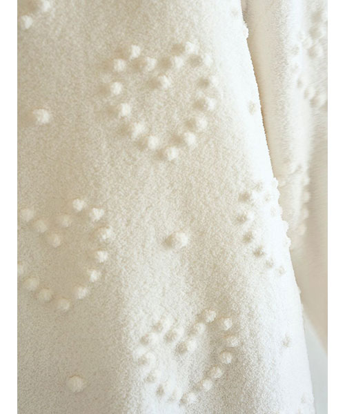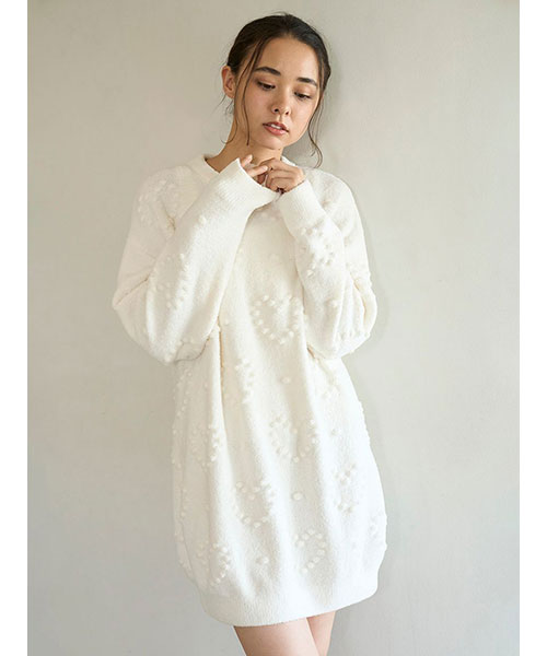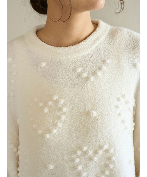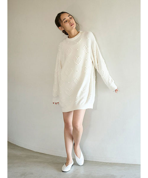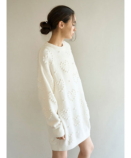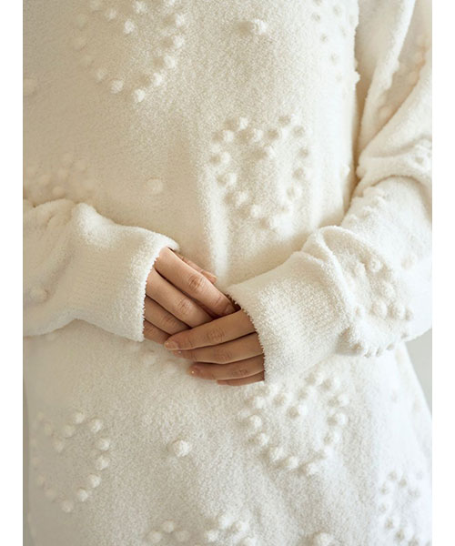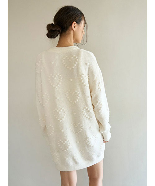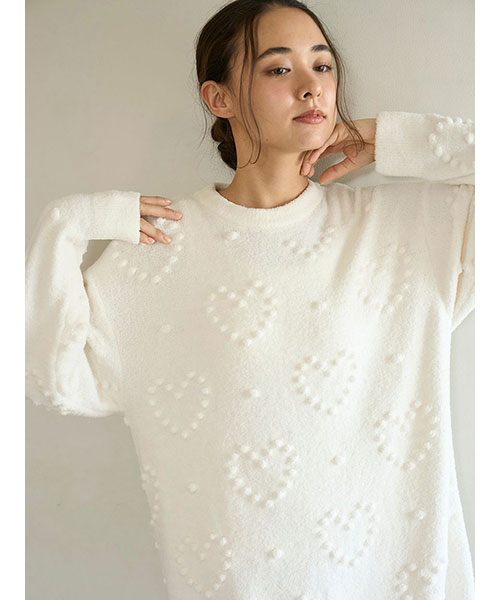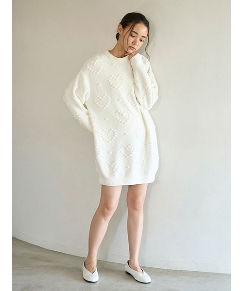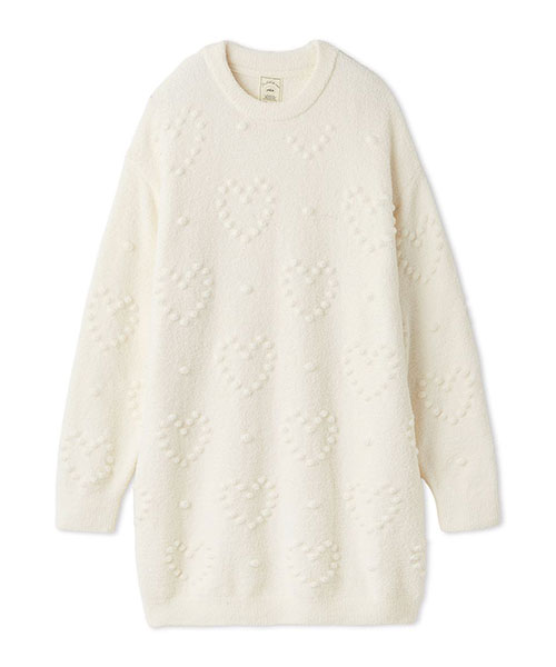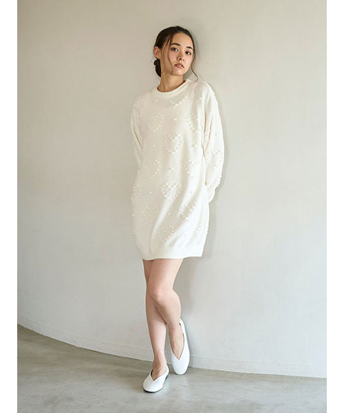 ぽこぽことした立体的な丸い編み目でハート模様を作った、暖かな風合いのニットシリーズです。やや短めの丈感で仕上げたワンピースは、ボリューミーな袖のバランス感がおしゃれなシルエット。色合いがシンプルなので、お好みのレギンスやボトムと合わせて幅広く着回せるのも魅力です。色はナチュラルなクリームと淡いブルーの2色をご用意しました。