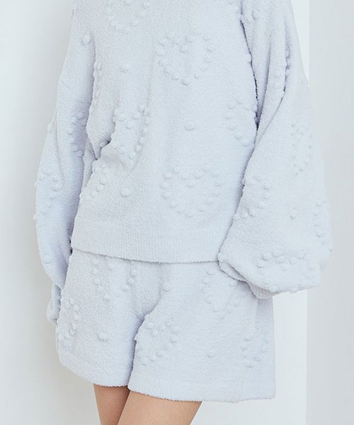 ぽこぽことした立体的な丸い編み目でハート模様を作った、暖かな風合いのニットシリーズです。やや短めの丈感でキャッチーなシルエットに仕上げたショートパンツ。ラブリーになりすぎない、程よくキュートなハート柄アイテムをお探しの方にもおすすめのアイテムです。色はナチュラルなクリームと淡いブルーの2色展開。同シリーズのプルオーバーやカーディガンとコーディネートしてお楽しみください。