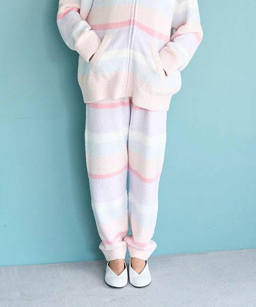 キャンディのようなカラフルなボーダー柄が幸せ気分を演出する、親子でお楽しみいただける’ベビモコ’シリーズです。ふっくら軽いはき心地のロングパンツは、裾を絞った動きやすいシルエット。毛足が長すぎないので、季節の変わり目から春先までロングシーズンでお楽しみいただける1枚です。左腰にワンポイントでロゴ刺繍も入れました。色はピンクとブルーの2色展開。同シリーズのパーカやプルオーバー、同時期に展開するキャンディ柄シリーズと合わせるのがおすすめ。KIDS、BABYアイテムとのリンク・コーディネートも可能です。