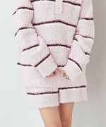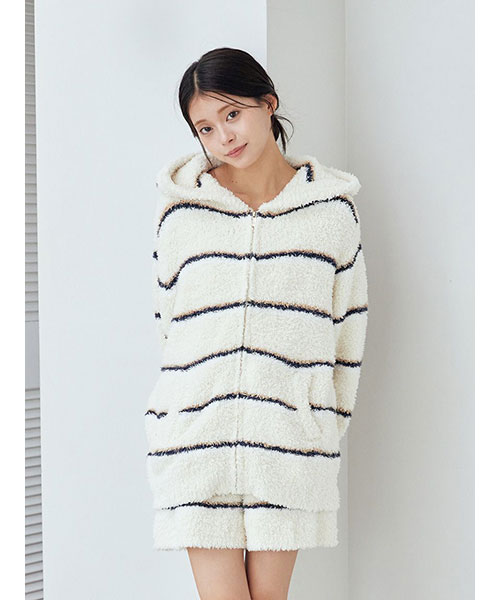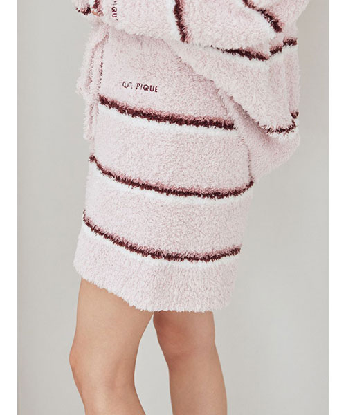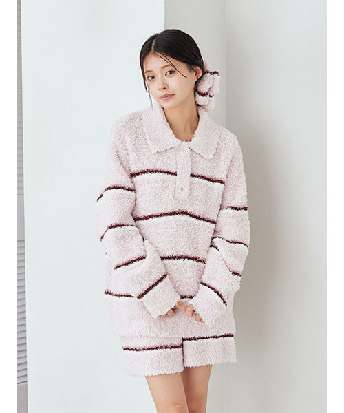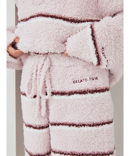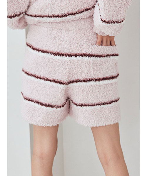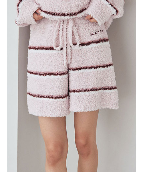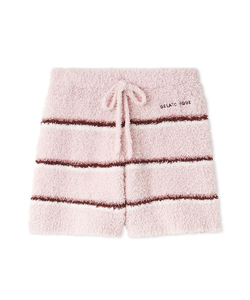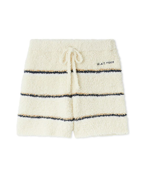 トレンドの細いピッチのボーダー柄を、毛足の長いもこもこ素材’ジェラート’に落とし込んだシリーズです。腰回りの冷え対策にもおすすめの、ふわふわのはき心地が幸せなショートパンツ。細いピッチの中にもしっかり配色を効かせて、今っぽいスクールテイストに仕上げました。色は甘いジェラートのようなアイボリーとピンク、ブルーの3色展開。同シリーズのトップスや小物と合わせたり、同時期に展開するカレッジロゴシリーズのロンTとコーディネートするのもおすすめです。