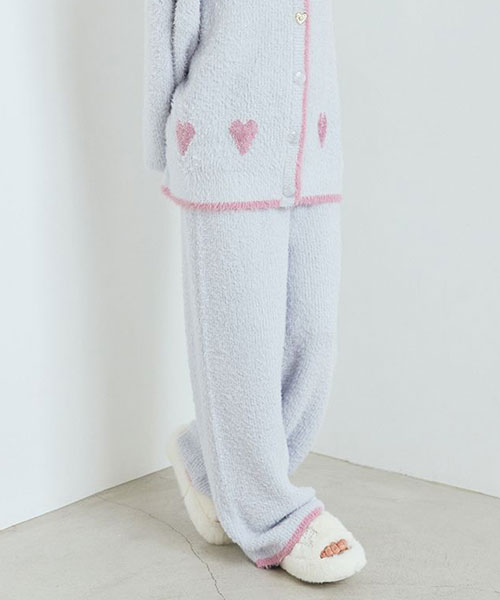 ホリデーシーズンの幸福感が溢れる、雪の結晶のようなラメとスパンコールを織り込んだフェザーニットのシリーズです。毛足が長く、ふんわりと軽やかなはき心地で足首までしっかりカバーするロングパンツ。左腰にエンブレムロゴ、ウエストや裾に配色デザインを入れてキャッチーに仕上げました。色はカラフルなライトブルー、ピンク、レッドの3色展開。同シリーズのプルオーバーやカーディガンを合わせてお楽しみください。