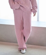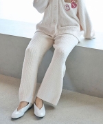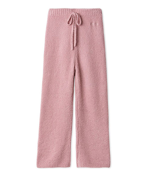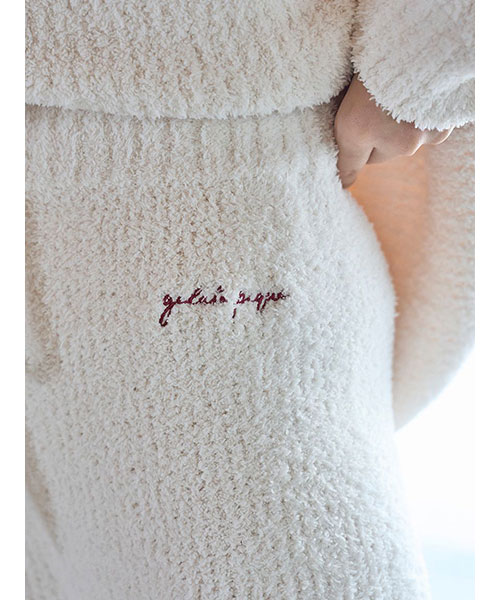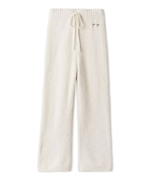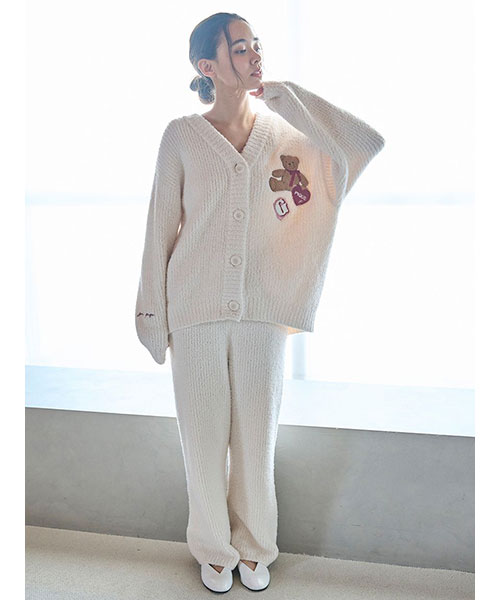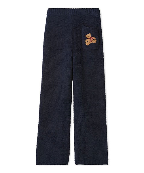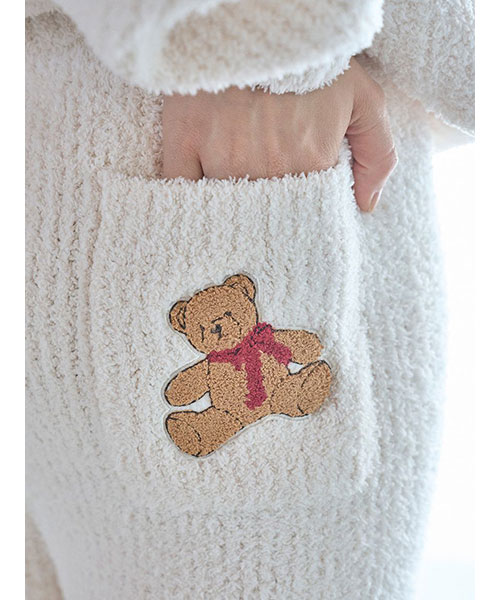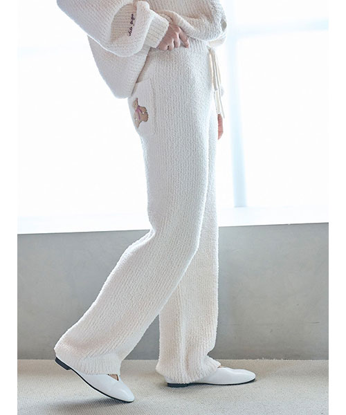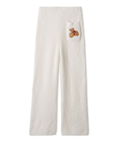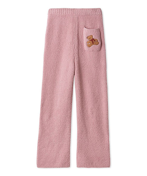 お気に入りのベアのぬいぐるみと暮らす、女の子のキュートなお部屋をイメージしたシリーズです。もっちり柔らかい‘ベビモコ’を畦編みにして使用したロングパンツ。左腰にロゴ刺繍を入れ、後ろポケットにはベアのぬいぐるみをモチーフにしたサガラ刺繍が入っています。すっきりとした動きやすいストレートシルエット。色はアイボリー、ピンク、ネイビーの3色展開です。同シリーズのカーディガンやプルオーバーに合わせたり、お揃いの柄を使用したフェイバリット柄シリーズと組み合わせてお楽しみください。