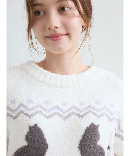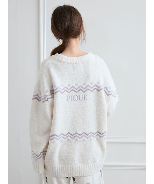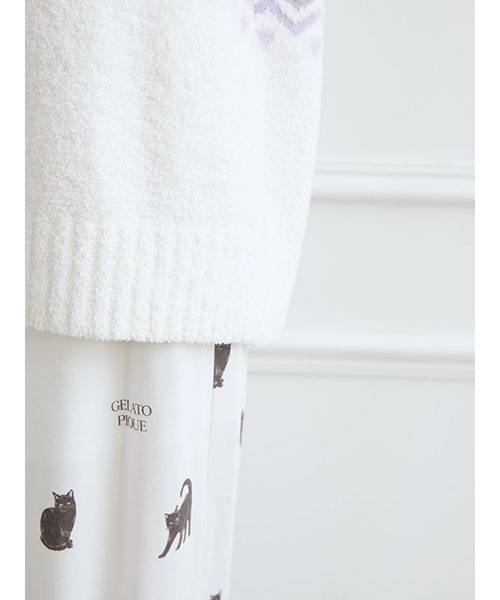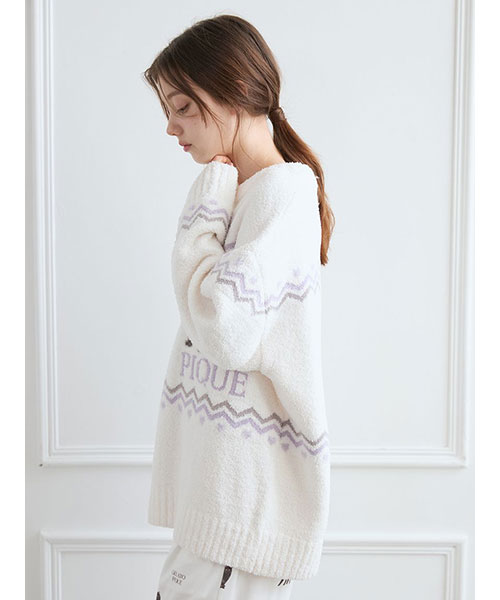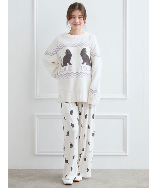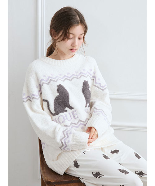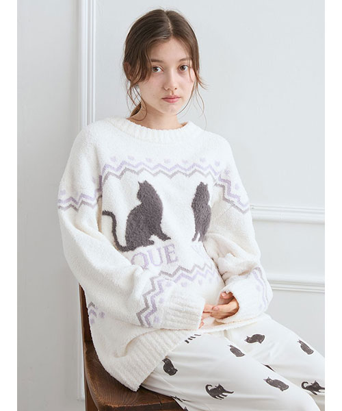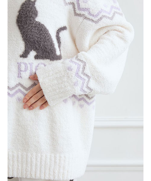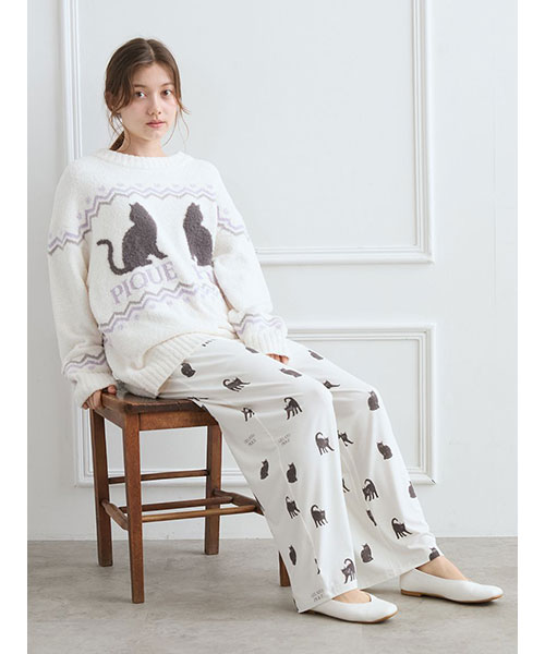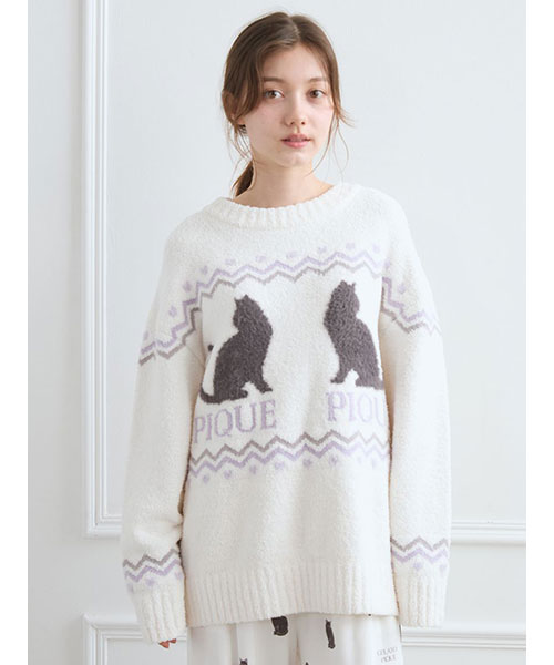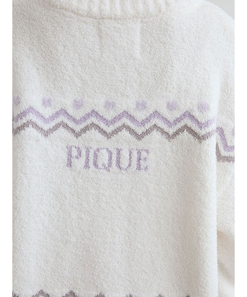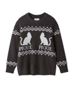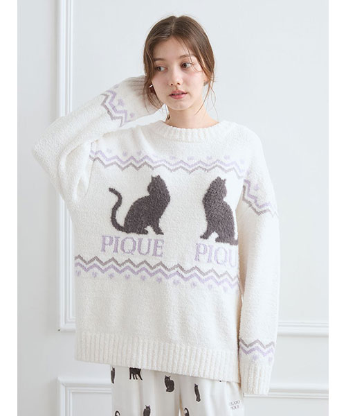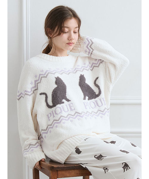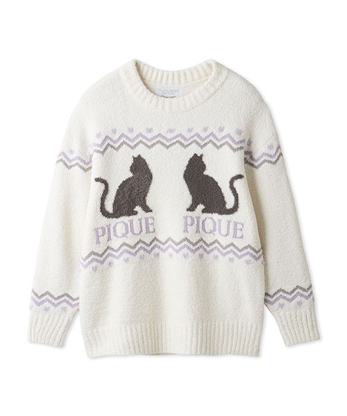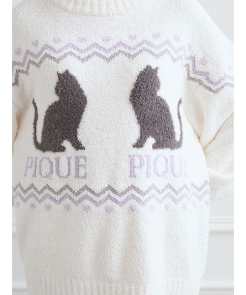 今年のHALLOWEEN COLLECTIONは、黒猫をモチーフとした女子ライクなモノトーンスタイル。温かみのあるノルディック柄の中に、ファーの黒猫とハート、PIQUEロゴを大胆にデザインしたジャガードプルオーバーです。ふっくら柔らかなニット素材と、ゆったりとしたシルエットが女の子らしい可愛さを演出。色はパープルを効かせたオフホワイトと、重くなりすぎないシックなダークグレーの2色をご用意しました。同シリーズのショートパンツやカットソーシリーズに合わせてお楽しみください。