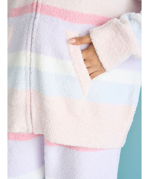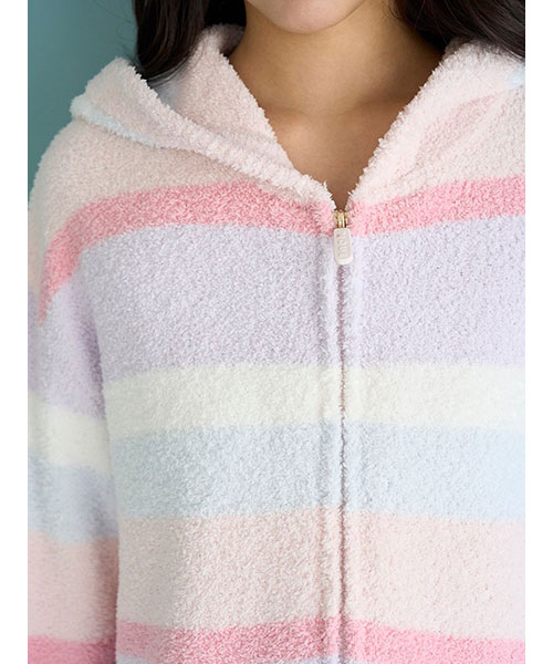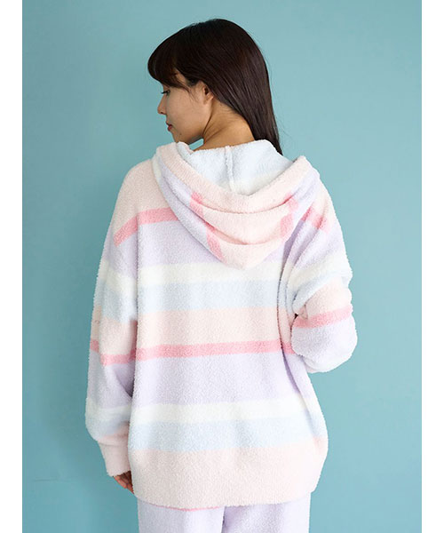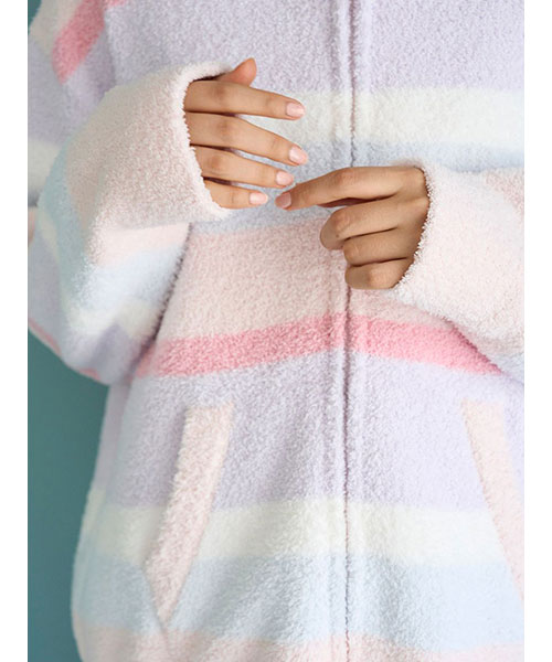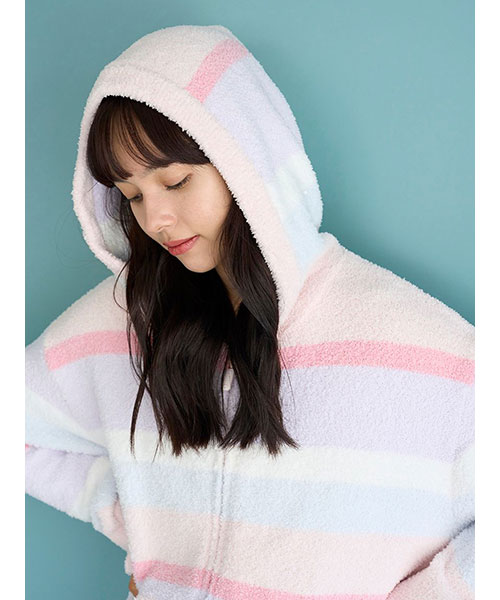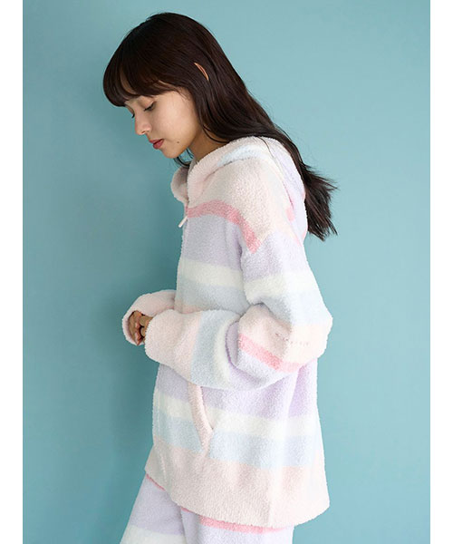 キャンディのようなカラフルなボーダー柄が幸せ気分を演出する、親子でお楽しみいただける’ベビモコ’シリーズです。ふっくら軽い着心地のゆったりとしたジップパーカは、1枚でも羽織りでも着こなせる便利なアイテム。毛足が長すぎないので、季節の変わり目から春先までロングシーズンでお楽しみいただける1枚です。左袖口にワンポイントでロゴ刺繍も入れました。色はピンクとブルーの2色展開。同シリーズのロングパンツや、同時期に展開するキャンディ柄シリーズと合わせるのがおすすめ。KIDS、BABYアイテムとのリンク・コーディネートも可能です。