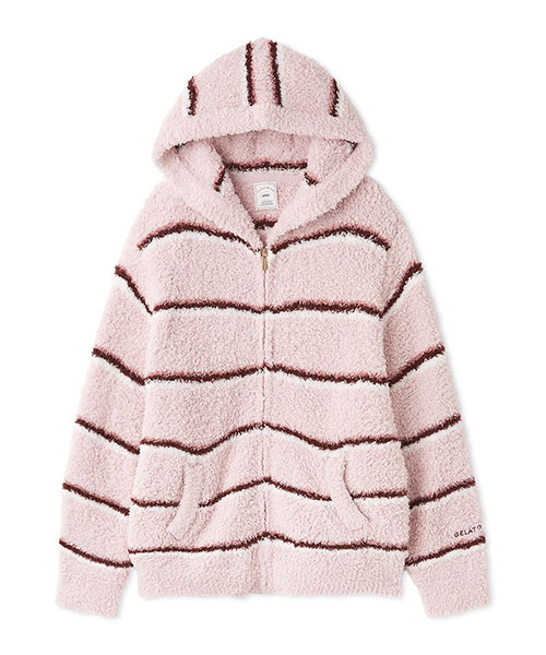 トレンドの細いピッチのボーダー柄を、毛足の長いもこもこ素材’ジェラート’に落とし込んだシリーズです。腰回りをしっかりカバーするゆったりシルエットのジップパーカは、これからの時期の羽織りにぴったりなアイテム。左袖口にはブランドのロゴ刺繍も入っています。細いピッチの中にもしっかり配色を効かせて、今っぽいスクールテイストに仕上げました。色は甘いジェラートのようなアイボリーとピンク、ブルーの3色展開。同シリーズのショートパンツや小物と合わせたり、同時期に展開するカレッジロゴシリーズのボトムとコーディネートするのもおすすめです。