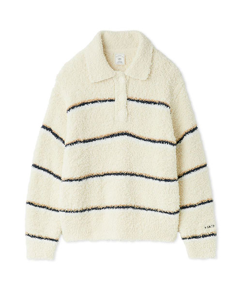 トレンドの細いピッチのボーダー柄を、毛足の長いもこもこ素材’ジェラート’に落とし込んだシリーズです。襟付きのポロシャツ風デザインが新鮮な、程良い抜け感のあるプルオーバー。ゆったりしたサイズ感で、ショート丈ボトムとの合わせがキュートなアイテムです。左袖口にはブランドのロゴ刺繍入り。細いピッチの中にもしっかり配色を効かせて、今っぽいスクールテイストに仕上げました。色は甘いジェラートのようなアイボリーとピンク、ブルーの3色展開。同シリーズのショートパンツや小物と合わせたり、同時期に展開するカレッジロゴシリーズのショートパンツとコーディネートするのもおすすめです。