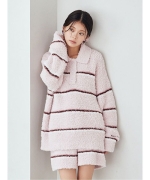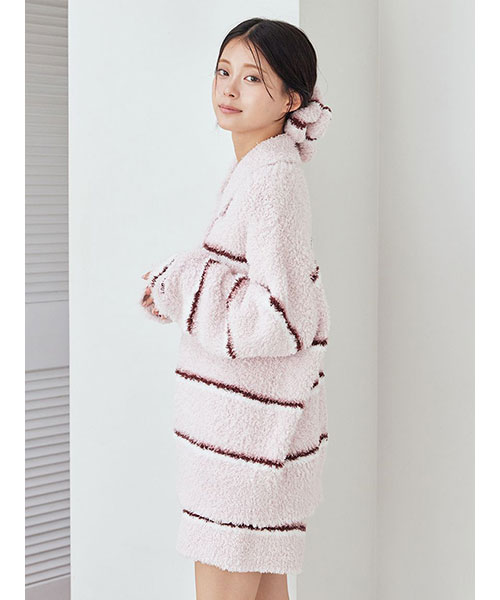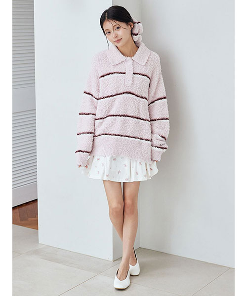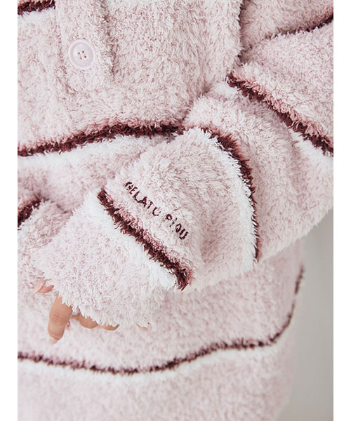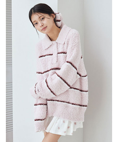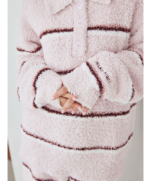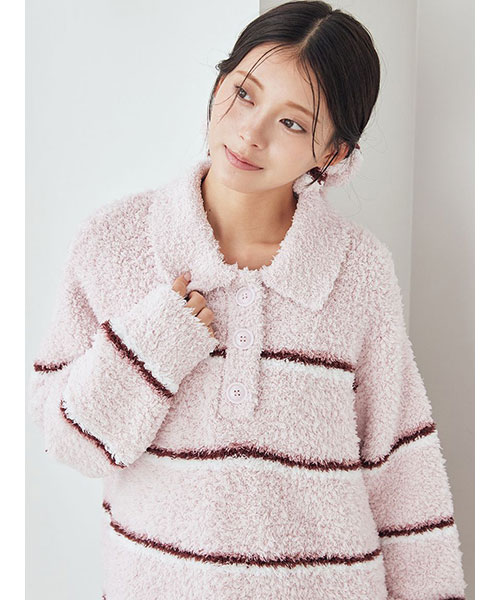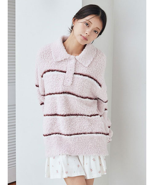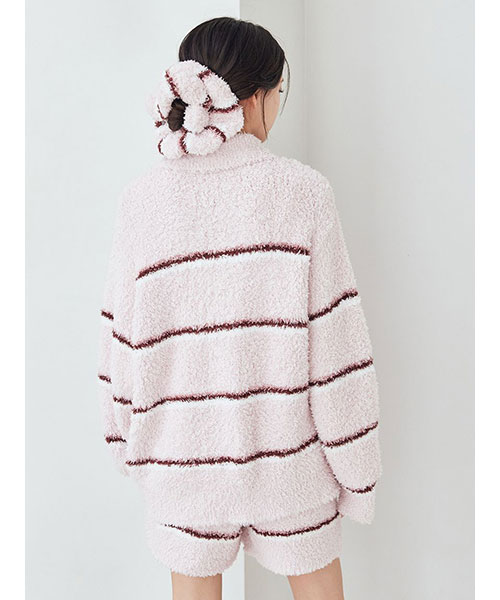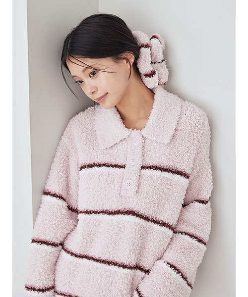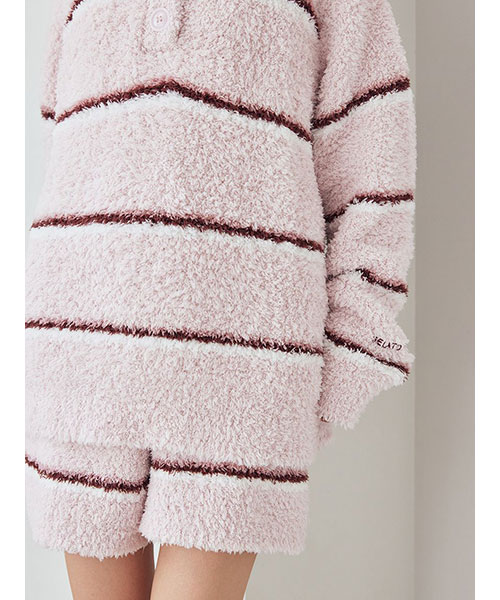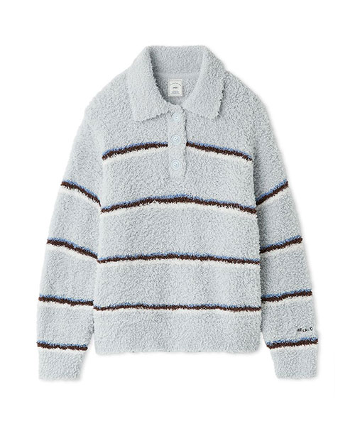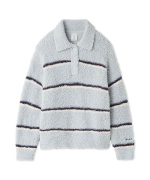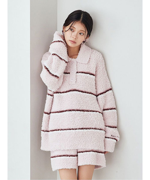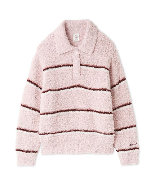 トレンドの細いピッチのボーダー柄を、毛足の長いもこもこ素材’ジェラート’に落とし込んだシリーズです。襟付きのポロシャツ風デザインが新鮮な、程良い抜け感のあるプルオーバー。ゆったりしたサイズ感で、ショート丈ボトムとの合わせがキュートなアイテムです。左袖口にはブランドのロゴ刺繍入り。細いピッチの中にもしっかり配色を効かせて、今っぽいスクールテイストに仕上げました。色は甘いジェラートのようなアイボリーとピンク、ブルーの3色展開。同シリーズのショートパンツや小物と合わせたり、同時期に展開するカレッジロゴシリーズのショートパンツとコーディネートするのもおすすめです。