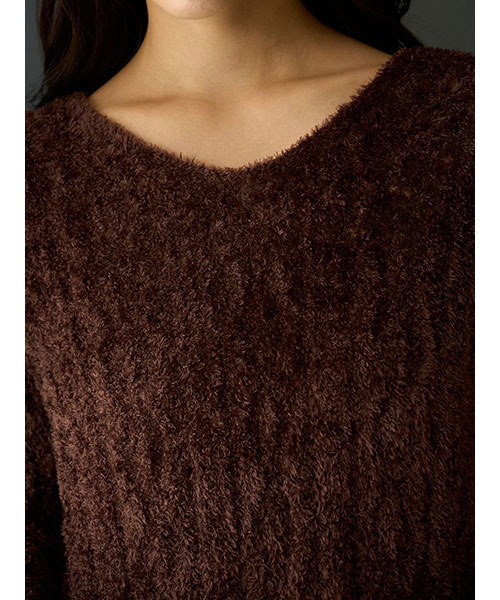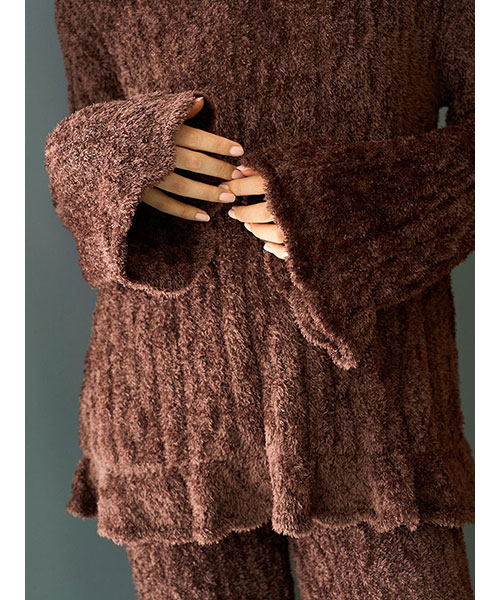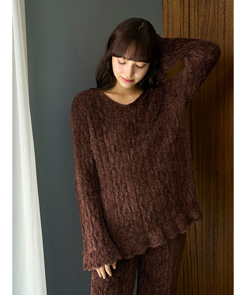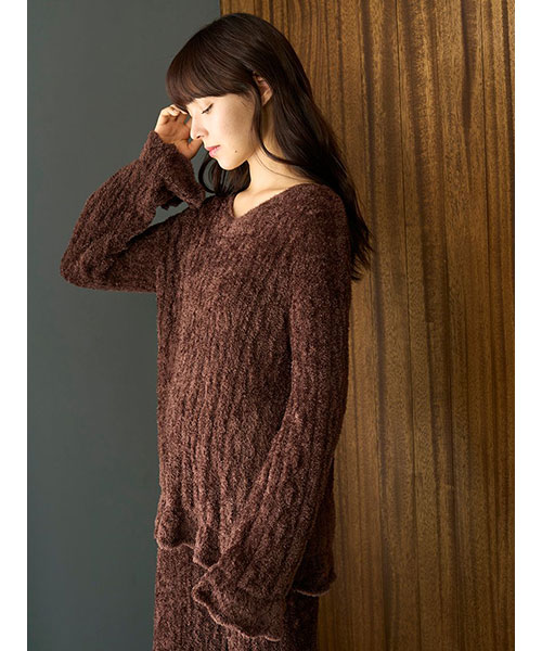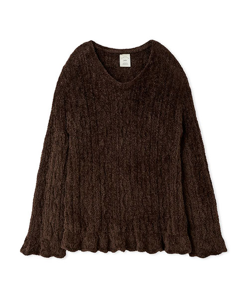 軽くなめらかな肌触りのフェザー糸を使用した、ヴィンテージライクな柄編みのニットシリーズです。裾と袖にフリルをあしらったプルオーバーは、ヒップが隠れる長めレングスがポイント。程よい透け感があるので、キャミソールやノースリーブ等にざっくりと重ねるだけで、トレンド感のある着こなしが完成します。色はイエローとブラウンの2色展開。同シリーズのロングパンツと合わせたり、同時期に展開するヴィンテージローズ柄シリーズとの組み合わせもおすすめです。