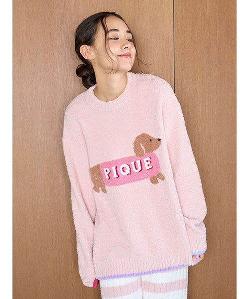 ちょこんとした手足が可愛いダックスフンドにPIQUEロゴをあしらった、‘ベビモコ’素材のプルオーバーです。PIQUEロゴはサガラ刺繍になっており、袖口や裾にはカラフルな配色デザインを入れてPOPな印象に仕上げました。色はブラウンのダックスをモチーフにしたピンクと、チョコレートタンのダックスをモチーフにしたグレーの2色をご用意。同シリーズのベビモコリブボーダーパンツやダックス柄のカットソーを合わせたり、KIDS、BABYサイズとのリンク・コーディネートもお楽しみいただけます。
