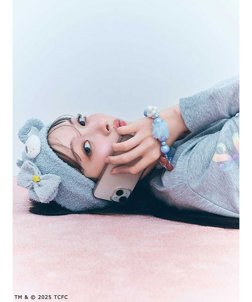 SNIDEL HOMEのためにもこもこのルームウェアを着てヘアターバンをつけて、お部屋でリラックスする様子を特別に描いてもらった描き起こしのケアベアたち。