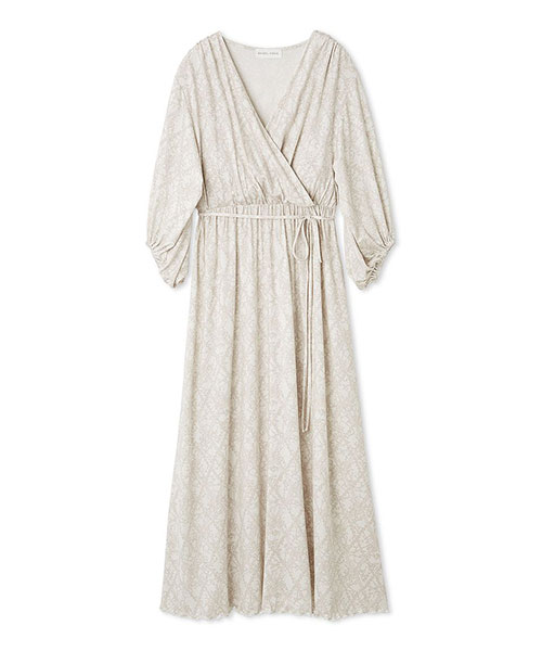 とろみのあるレーヨンカットソーに、ヴィンテージ感のあるレースを総柄プリントしたカシュクールワンピースです。