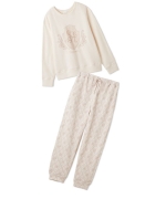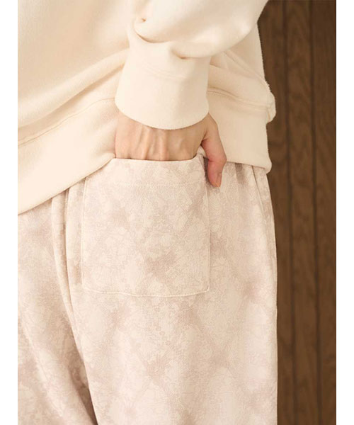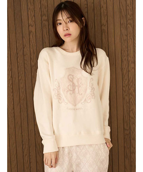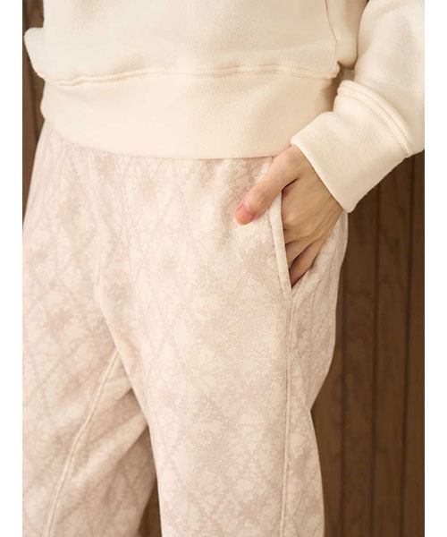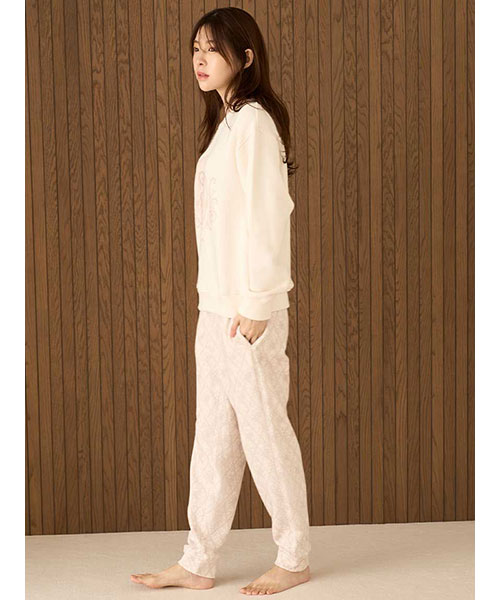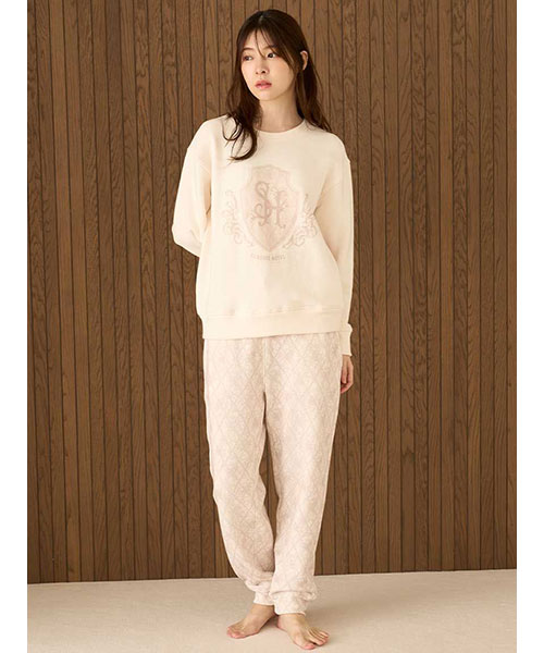 プルオーバーはエムブレム風のロゴデザイン、裾絞りシルエットのロングパンツはレース調の総柄プリントになっています。