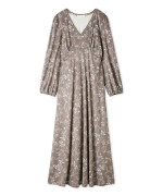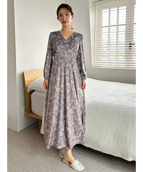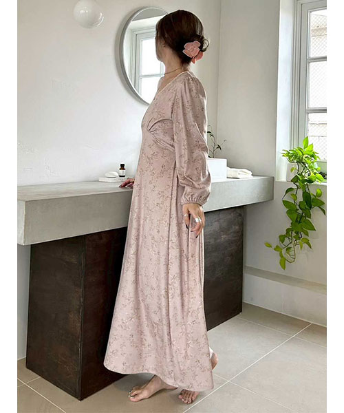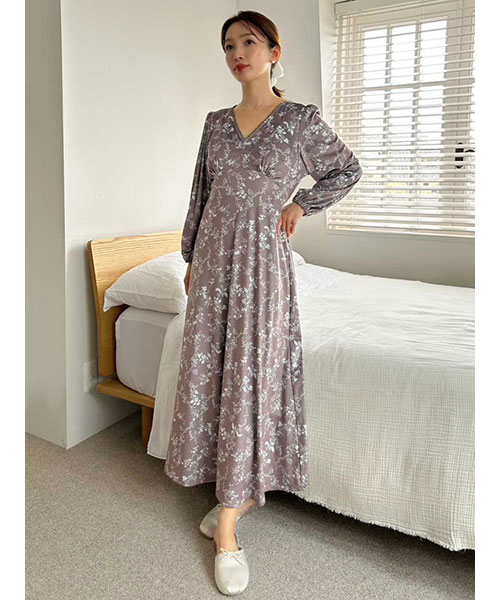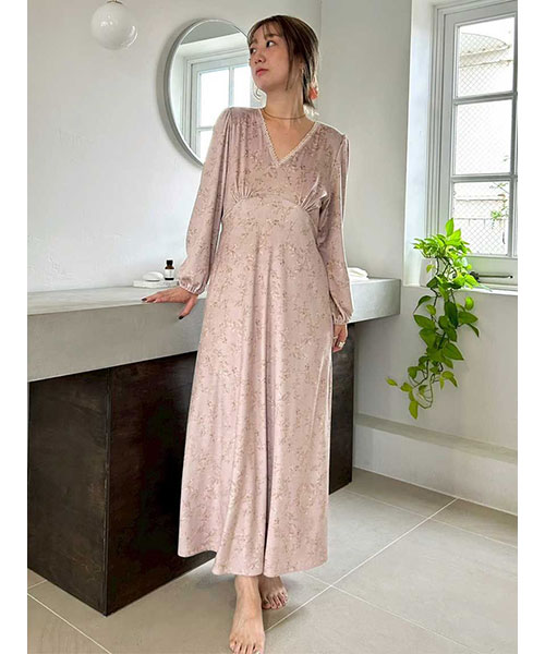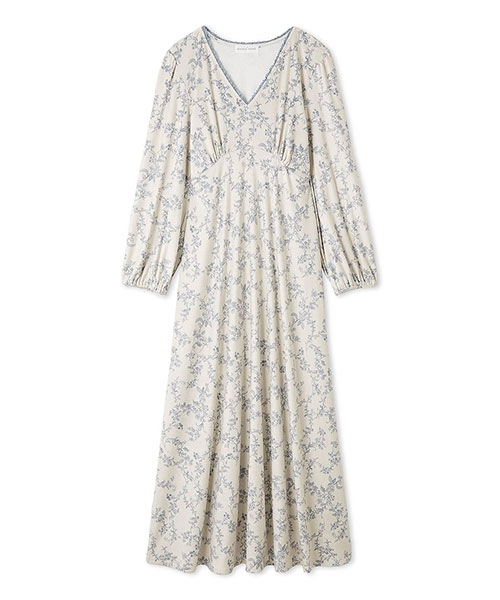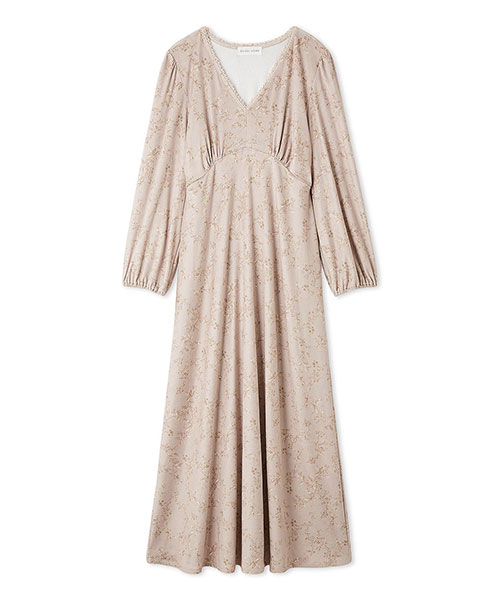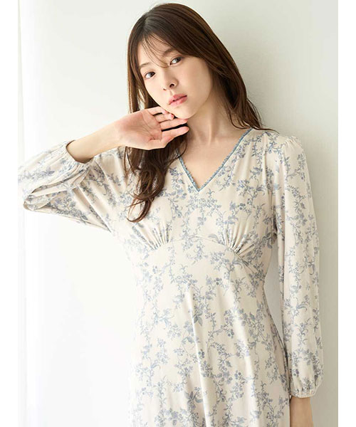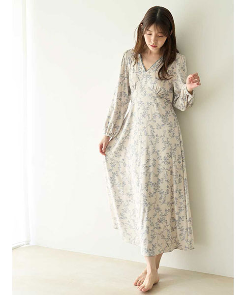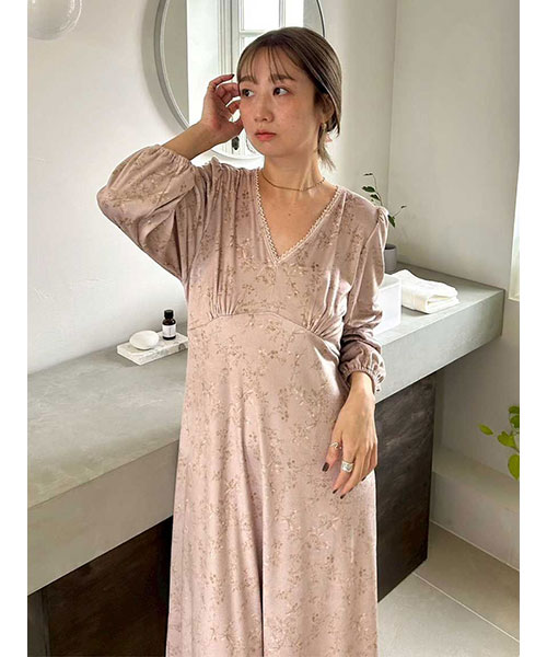 Vネックの胸元にピコレースをあしらったロングワンピース。