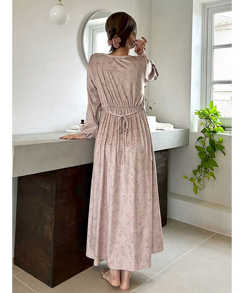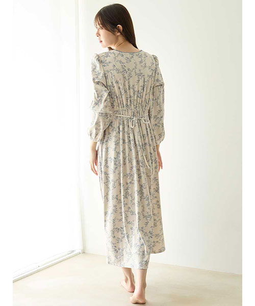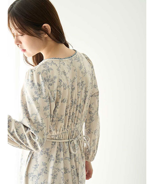 バスト下に切り替えギャザーを入れ、ウエストに入れた紐でサイズ感を調整して着用いただけます。