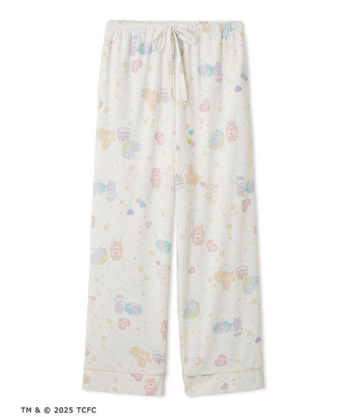 星が瞬く夜空で、描き下ろしの5匹のケアベアたちがくつろぐ総柄プリントのパジャマシリーズです。