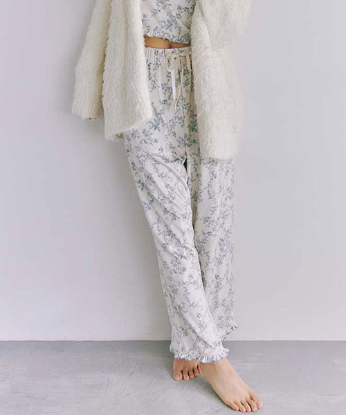 裾や両脇のポケット口にもメローフリルを入れた、雰囲気のあるロングパンツ。
