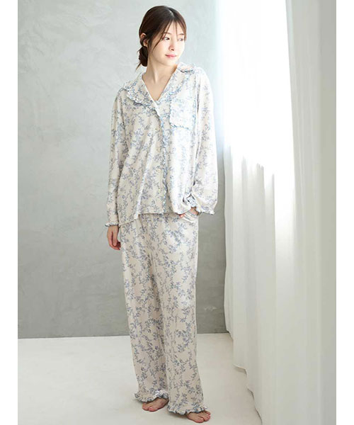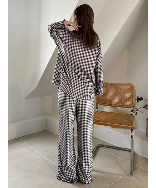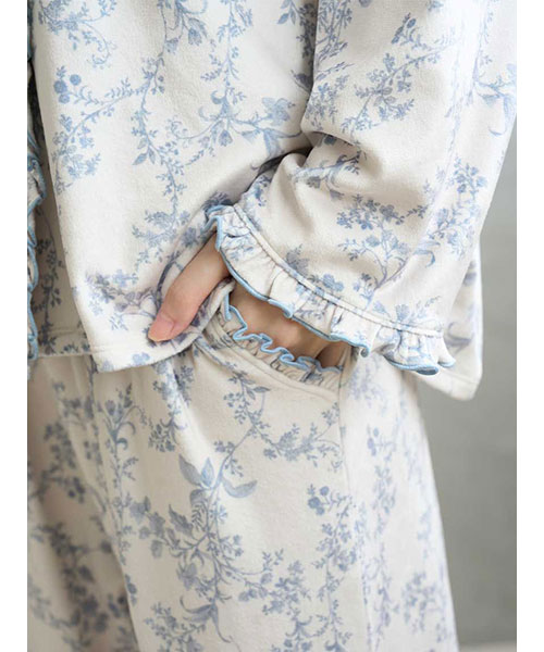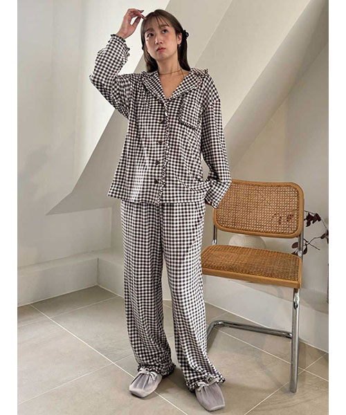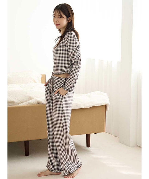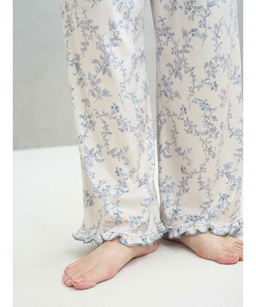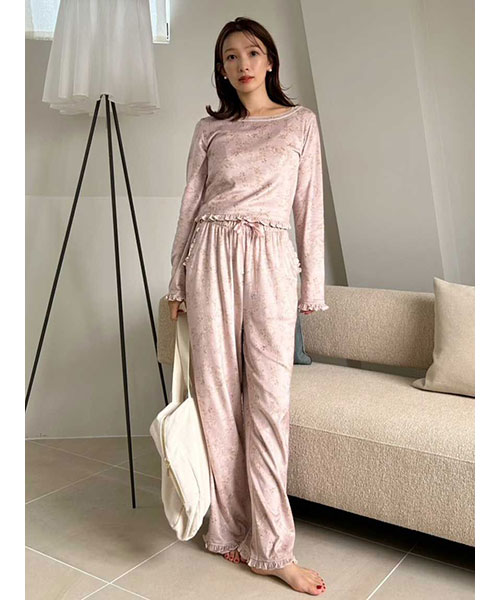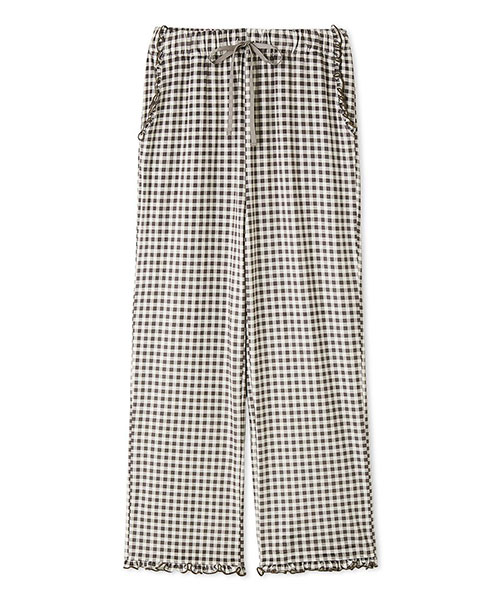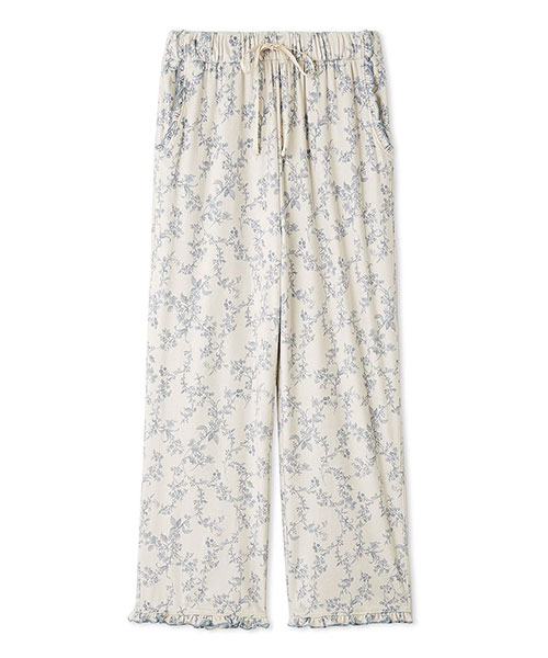 裾や両脇のポケット口にもメローフリルを入れた、雰囲気のあるロングパンツ。