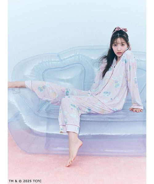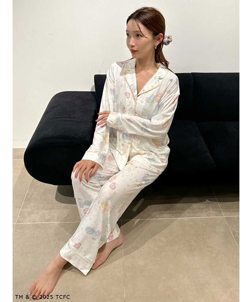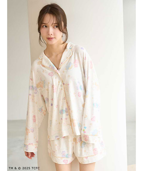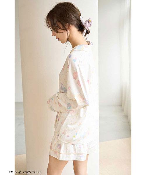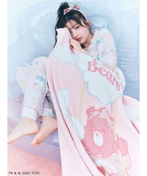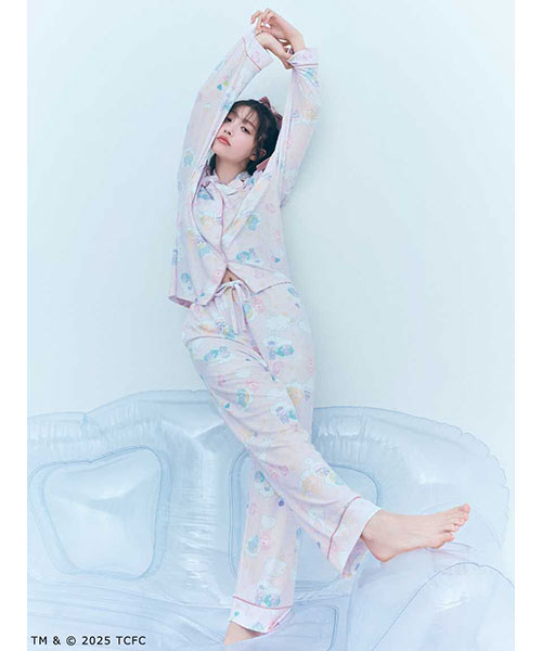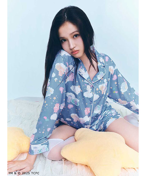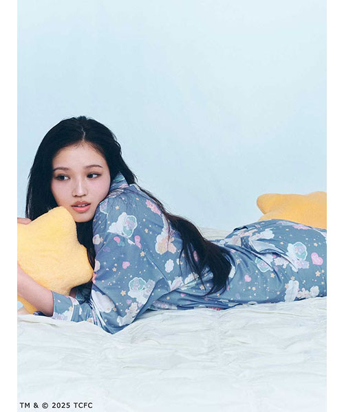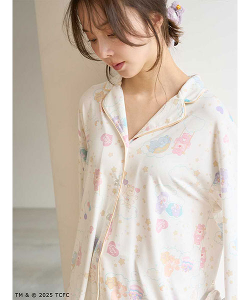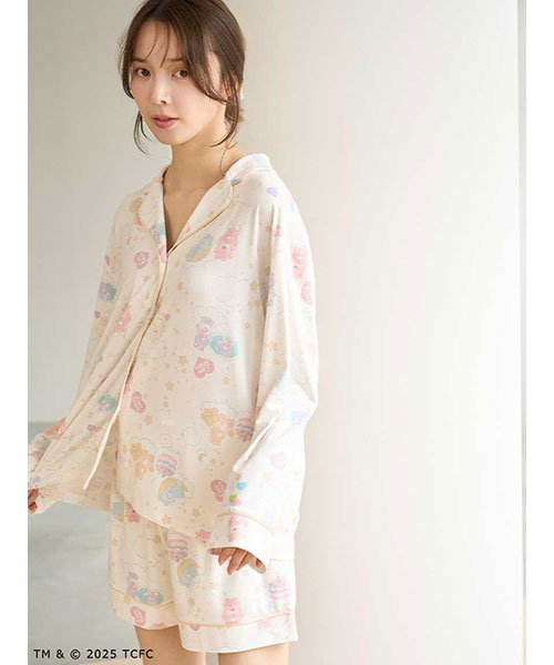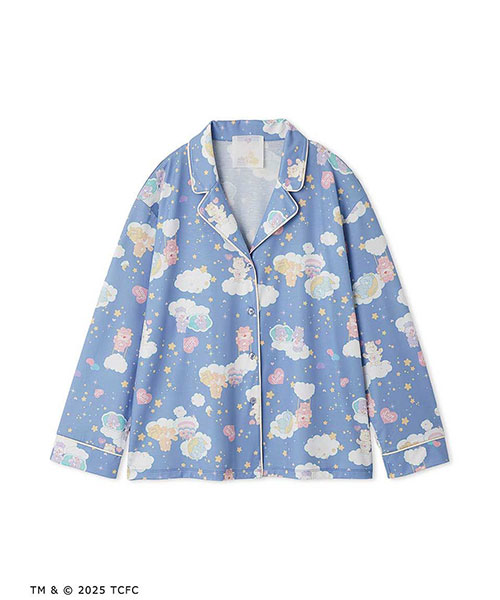 星が瞬く夜空で、描き下ろしの5匹のケアベアたちがくつろぐ総柄プリントのパジャマシリーズです。