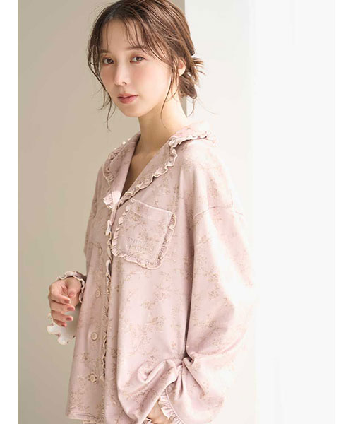 襟元や袖口などに入れたたっぷりのメローフリルがロマンティックな開襟シャツ。
