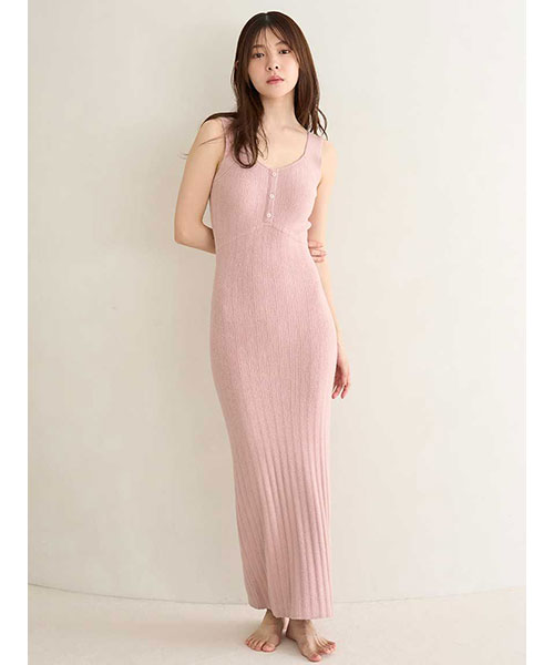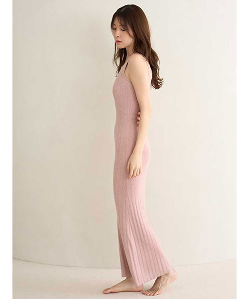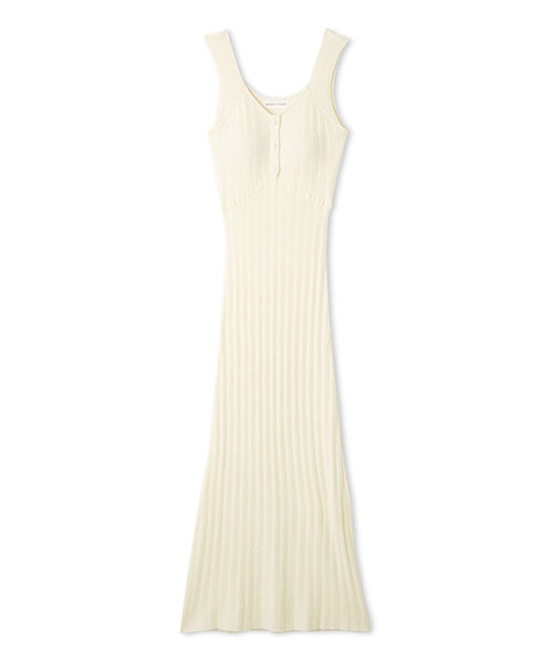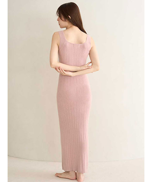 エレガントなネックラインがデコルテを美しく魅せる、柔らかなリブニットのタンクワンピース。