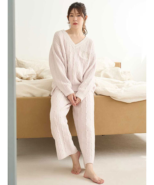 季節感のあるケーブルニットを使用した、プレッピーテイストが漂うセットアップです。