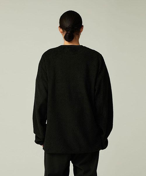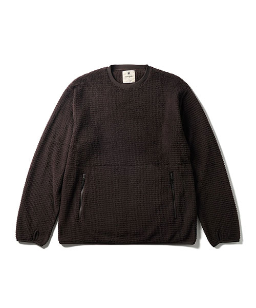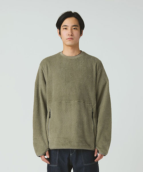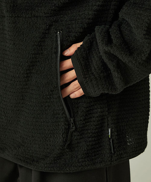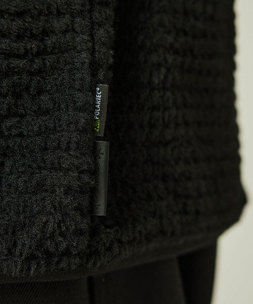 素材は、POLARTEC社の「ALPHA DIRECT」を使用。ポーラテックアルファダイレクトの中でも厚手の生地を用いていて、高い保温性を備えつつ、メッシュ構造であるゆえに高い通気性を発揮。熱気や湿気が篭もることなく、快適な環境を保ちます。また優れた速乾性で、汗や小雨で濡れてしまった場合にも保温力が低下しづらいのも特徴です。