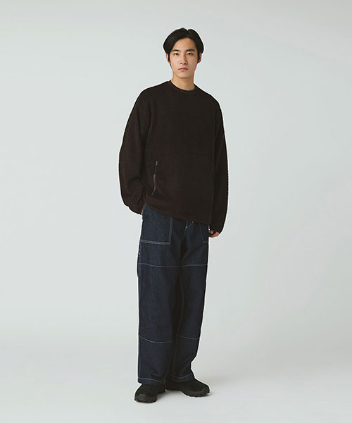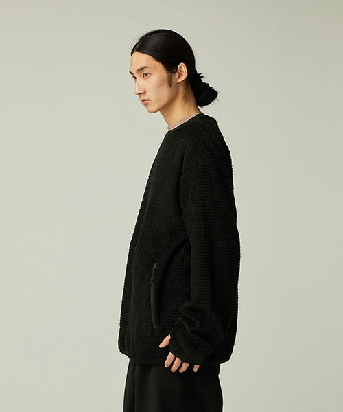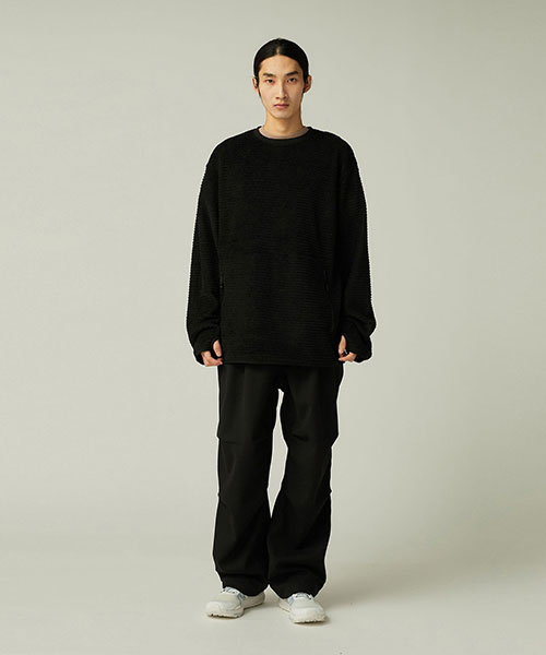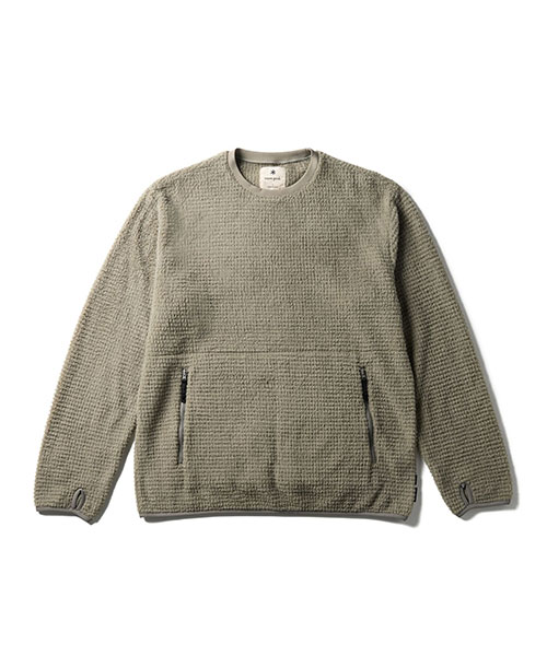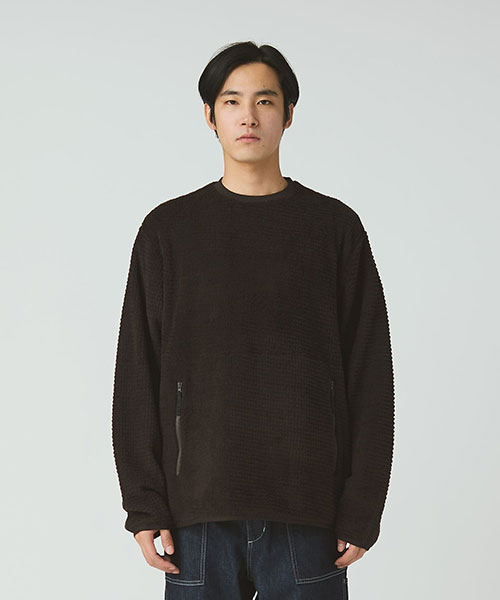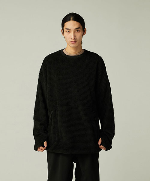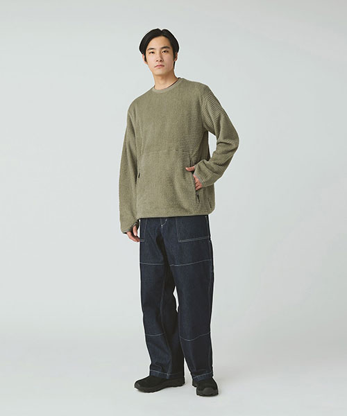 スウェットシャツのように一枚着として、Tシャツの上に重ねてアウターとして、またジャケットの中に挿し込んでミドラーとして、幅広く活躍するプルオーバーです。袖口は手の保温や日焼け対策にもなる、サムホールを設けています。脇には収納物の落下を防ぐファスナーポケット付き。