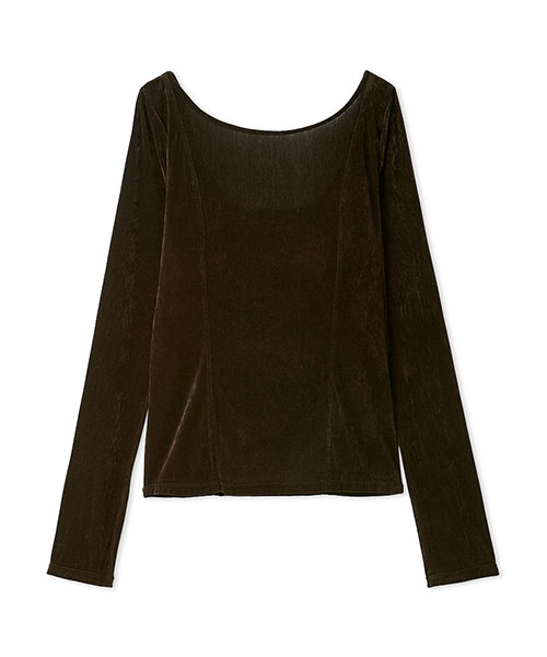 エレガントな艶感とシアー感のある柔らかなベロアチュール素材を使用してお作りした、レイヤードスタイルに便利なカップインベロアカットソーが届きました。表生地には伸縮性があり着心地も抜群。薄軽素材なので、秋冬先取りアイテムとしても便利です。また、重たくなりがちな冬のレイヤードコーデにも抜け感をプラスします。カーヴィーな切り替えを入れボディラインに寄り添うフィット感のあるデザインで仕上げているので、タックインスタイルもすっきりキレイにキマります。短丈のカップインキャミがセットになっているので、インナーに困らず着用できます。オーバーサイズコートジャケット(SWFJ255069)合わせもおすすめです。