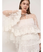 小さなフラワー刺繍模様を散りばめ、裾には印象的なレーストリミングを施した、繊細なホワイトレース生地でお作りした1色展開です。