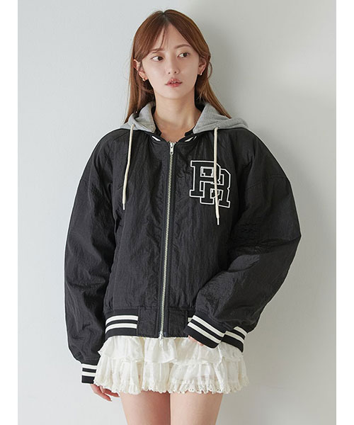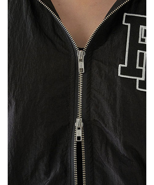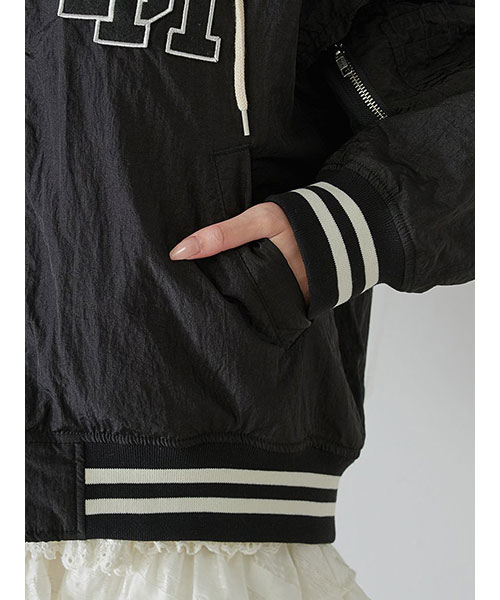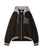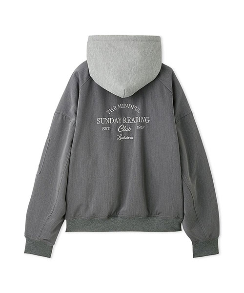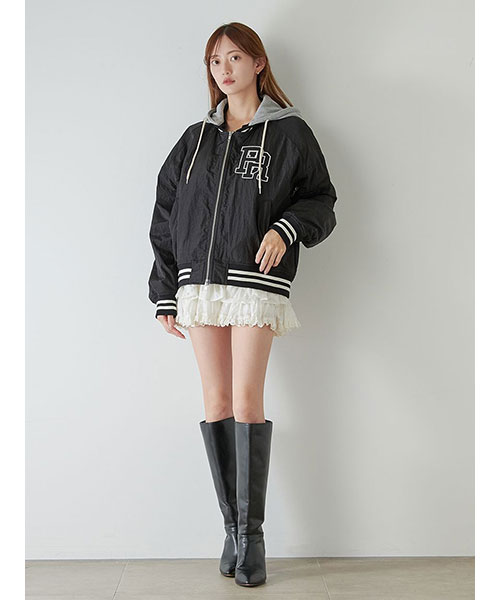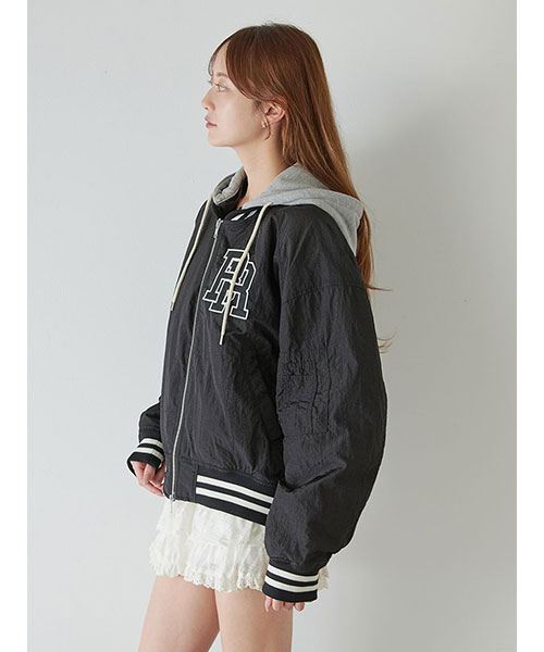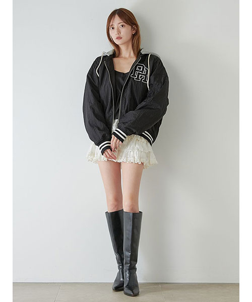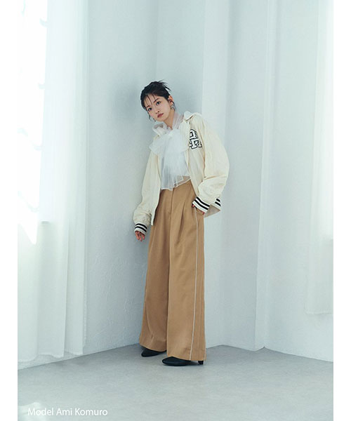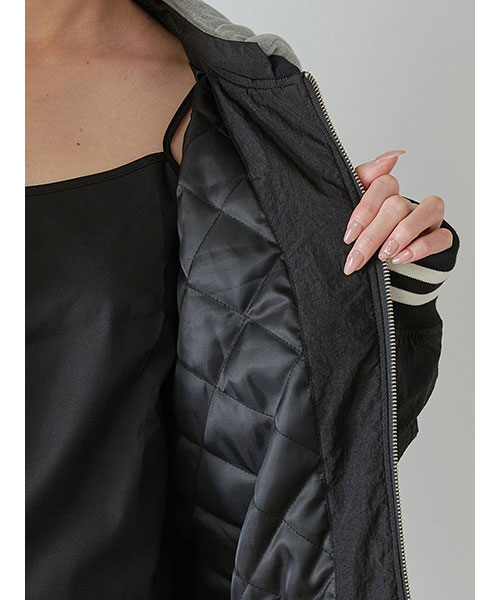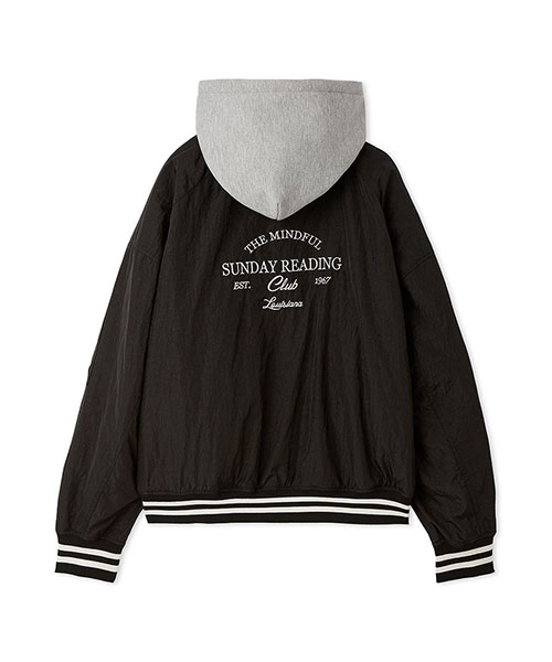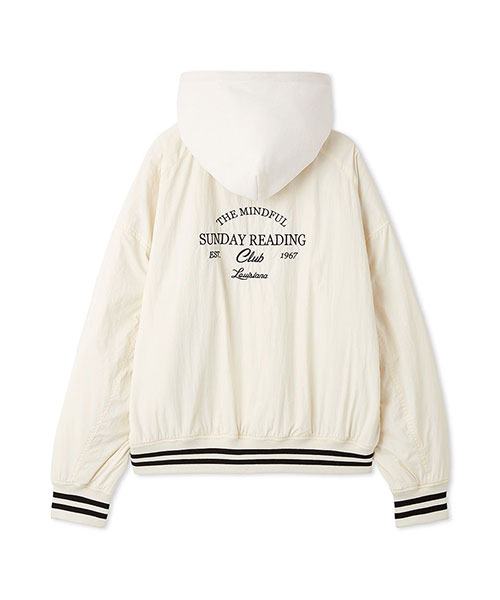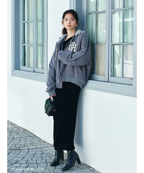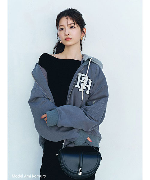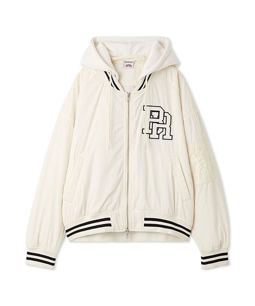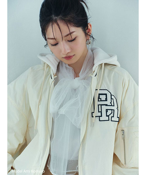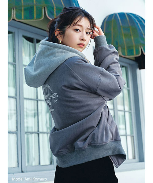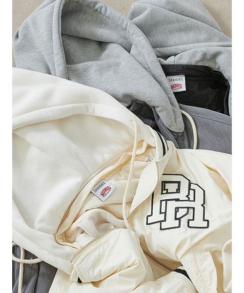 1980年代よりアメリカのライセンスグッズなどを手掛けてきた「NUTMEG」と「SNIDEL」のコレクションアイテムとして、フード付きスタジャンが登場。ゆったりとしたサイジングがメンズライクで今季らしいアイテムです。アイボリーとブラックはやや光沢感のあるナイロン素材・グレーはキレイめなスーツ調の生地で仕立て、取り外し可能なフードがついています。フーディーをブルゾンにレイヤードしたようなデザインが魅力です。実用性・快適さと「SNIDEL」の洗練されたデザインが融合したアイテムに仕上がりました。フロントにはトレンド感のあるロゴ刺繍を配置。スポーティーな雰囲気ながらバックスタイルには繊細な刺繍を施し、SNIDELのテーマ”ストリートフォーマル”を表現しています。左右にジップ付きのポケットが付いています。ペンポケットを装備した左腕のミニポケットも特徴的。裏地は中綿入りキルトでロングシーズン活躍してくれます。