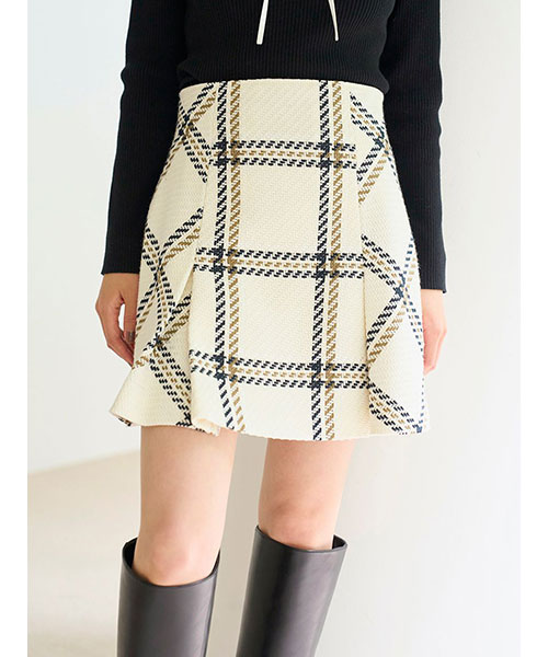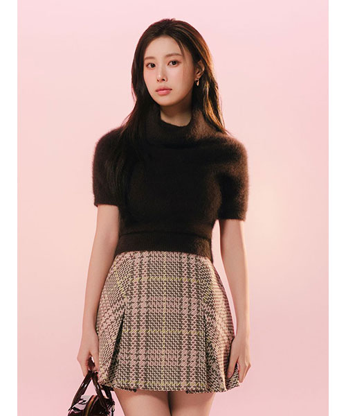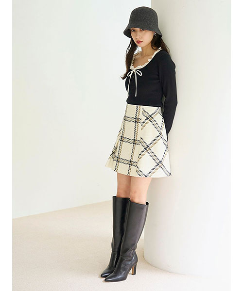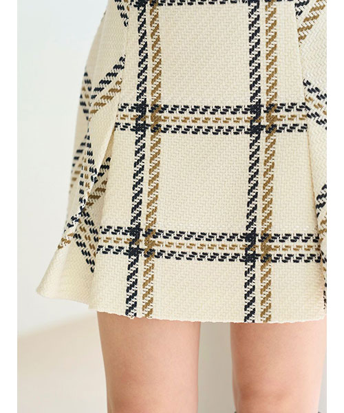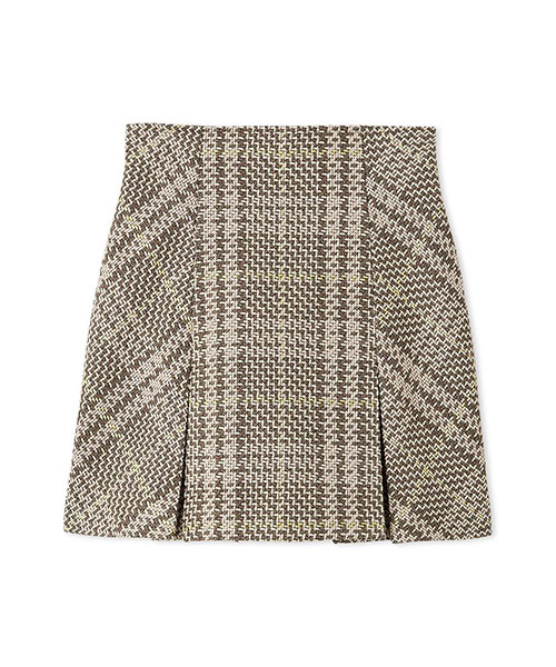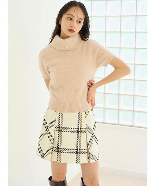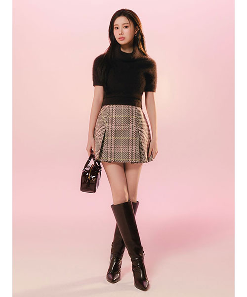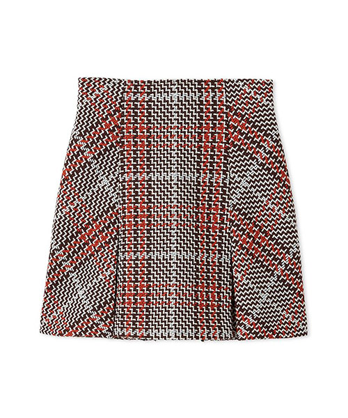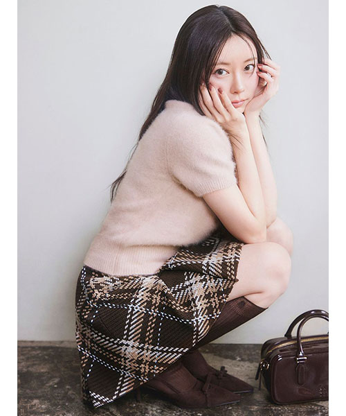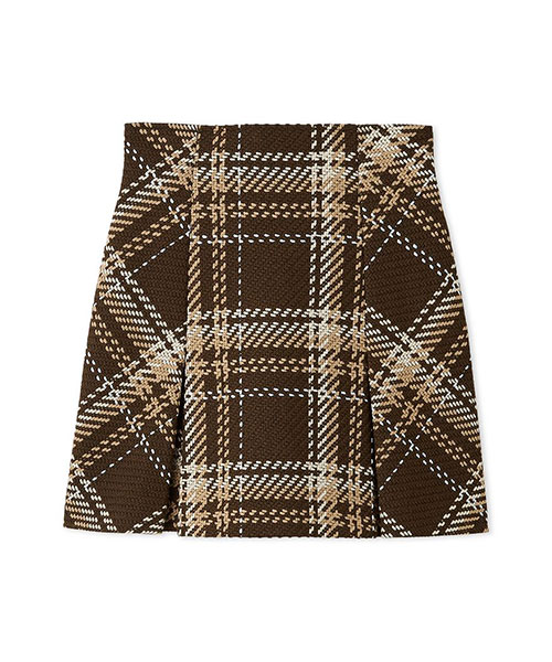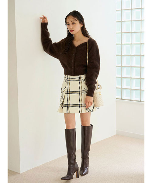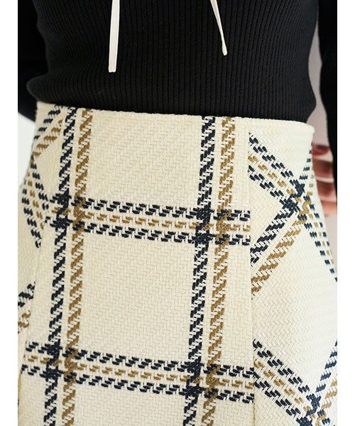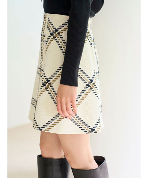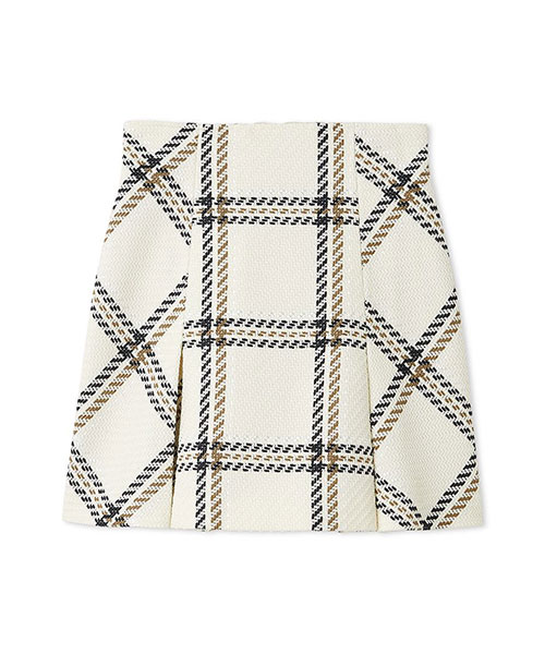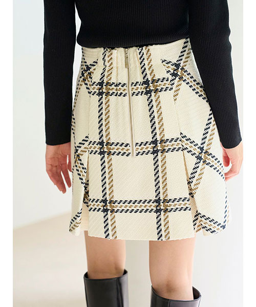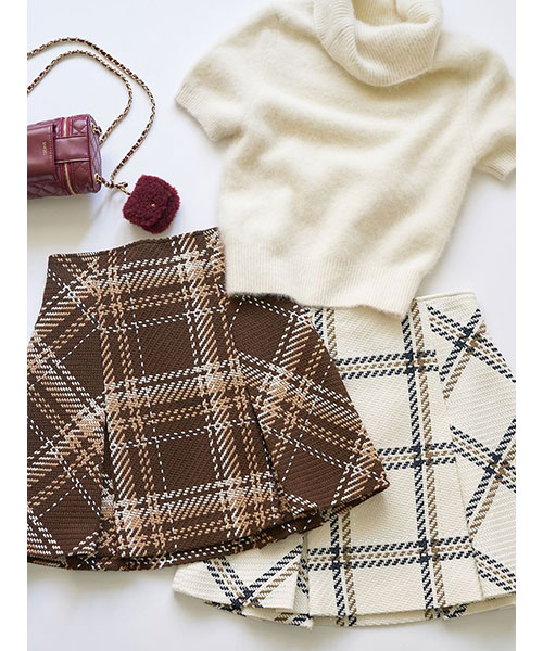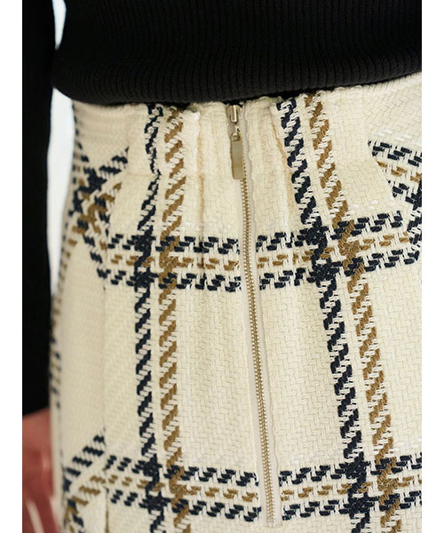 大人気のロービングチェックミニスカートを今季らしくアップデート。シーズンムード溢れる華やかな色味のロービングヤーンを使用し、クラシカルなルックスがスタイリングの品を高める1着です。今回はカラーにより異なる柄を採用し、それぞれ印象を変えてお作りしました。アイボリーは、ネイビーとブラウンを利かせた清楚な大柄チェック。ブラウンは定番人気の大柄チェック柄です。艶感のある水色の差し色を利かせた配色が魅力です。レッドとピンクは細かい千鳥柄をベースに仕上げており、きちんと感がありながらも華やかなアイテムに仕上がりました。サイドの生地をバイアス使いにしてモードな印象にしつつ、視覚効果でスタイルアップも。シルエットはいつもよりややフィット感を出し、トップスをインしてもスッキリと着こなせるハイウエスト仕様で、脚長効果も期待できます。リサイクルポリエステルを使用したサスティナブル素材でのお作りです。背中側のファスナーで着脱いただけます。ロング丈(SWFS254144)のデザインもご用意がございます。